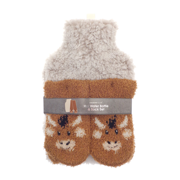 Supersoft Highland Cow Design Hot Water Bottle and Socks Cosy Gift Set