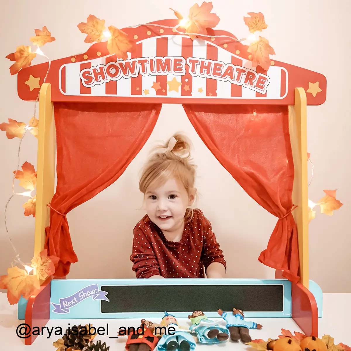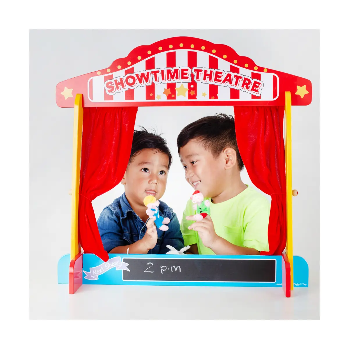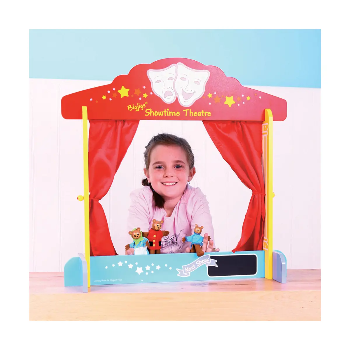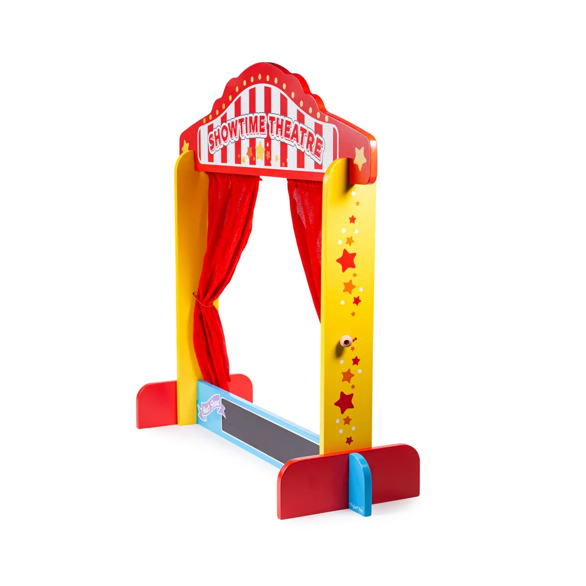 It's showtime! Little puppet masters can put on their own award-winning performance at the Bigjigs Toys Showtime Puppet Theatre. Every performance is bound to be a crowd-pleaser with this delightful wooden puppet theatre. Our best-selling puppet theatre toy is generously sized so that children can sit behind the stage and direct their own show. It's small enough to be rested on a table. The wooden frame is made from premium quality, sustainable materials and comes complete with red silk effect curtains and a chalkboard to inform spectators of the next showtime. Encourages imaginative solo and group roleplay. Just add any number of finger puppets from the Bigjigs Toys Puppet Theatre range and the stage is set for creativity!