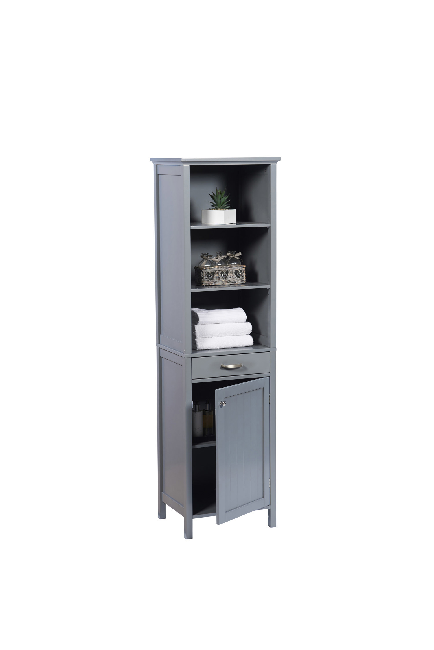 Meet the ultimate organisation aid – a Tall Storage Cabinet finished in a trendy charcoal grey. Comprising three top shelves, the unit provides a beautiful opportunity to bring character to an otherwise lacklustre room with ornaments, plants or even towels. A small draw and enclosed shelf allows homeowners to store away unsightly bathroom paraphernalia, maintaining their minimalist style. With a rather contemporary design, such a piece would blend in effortlessly with any interior space, from the super modern to those more traditional. Consider it the ideal finishing touch for your bathroom. Home assembly required. W47.5 x D38 x H170cm