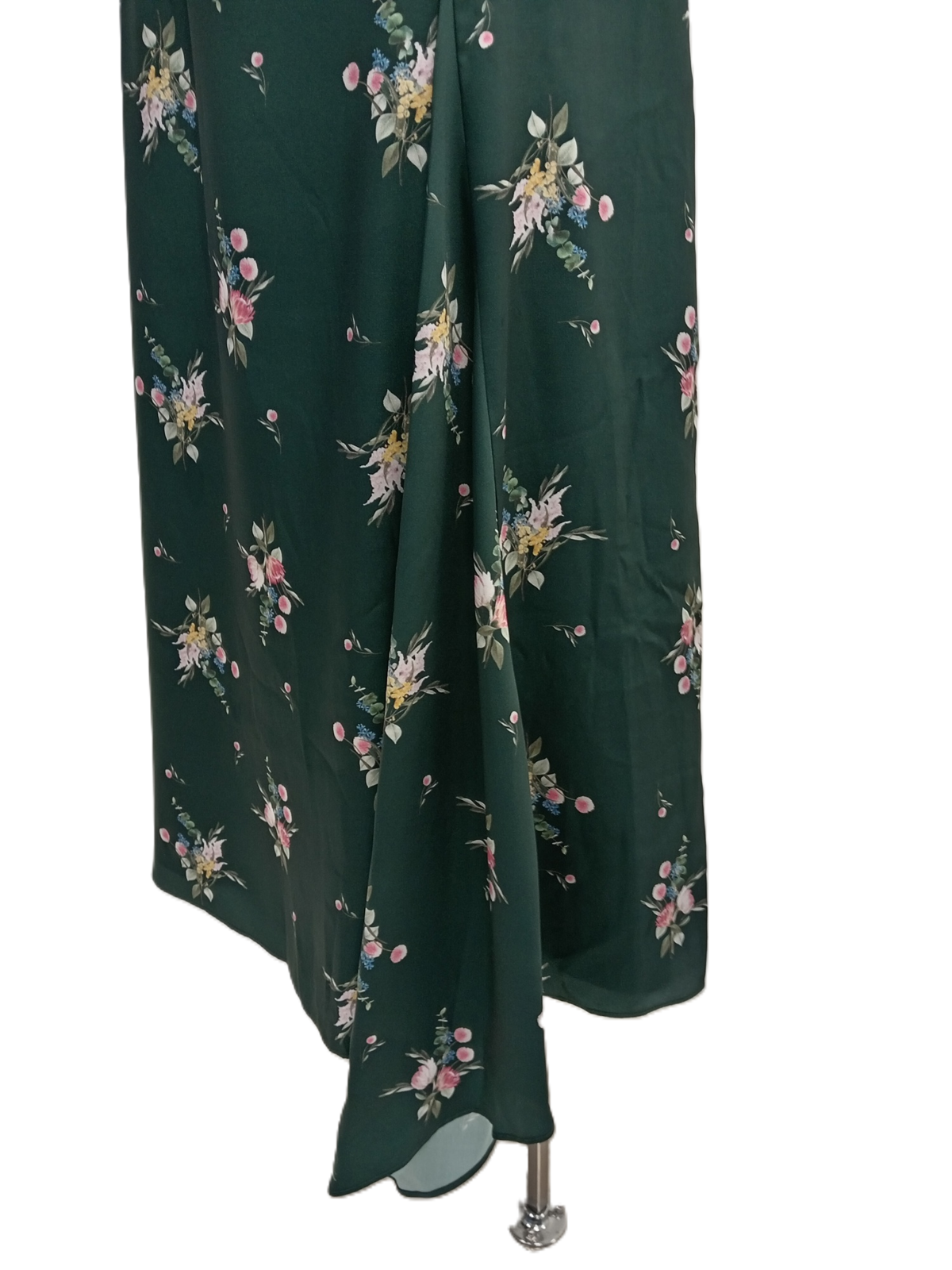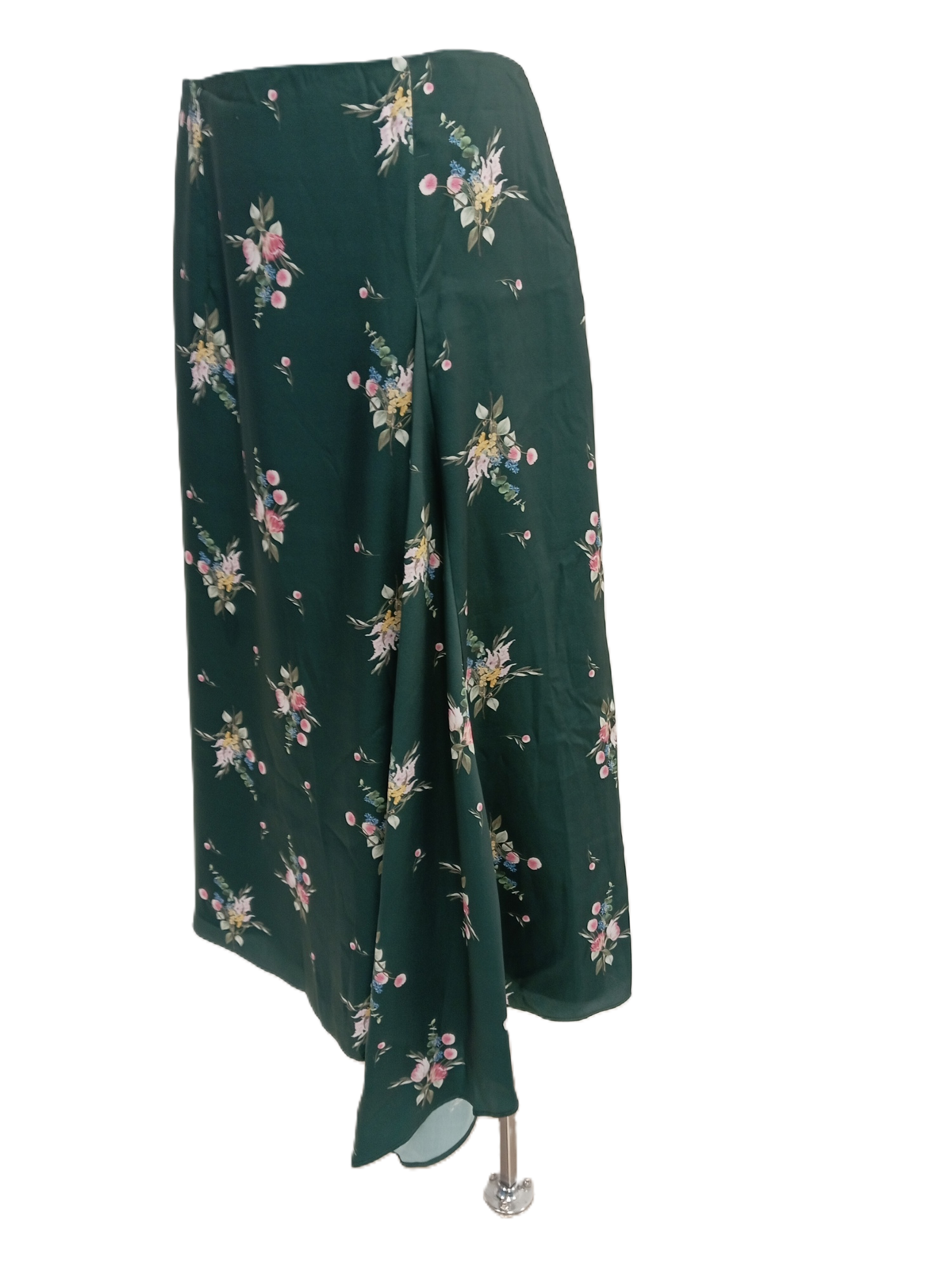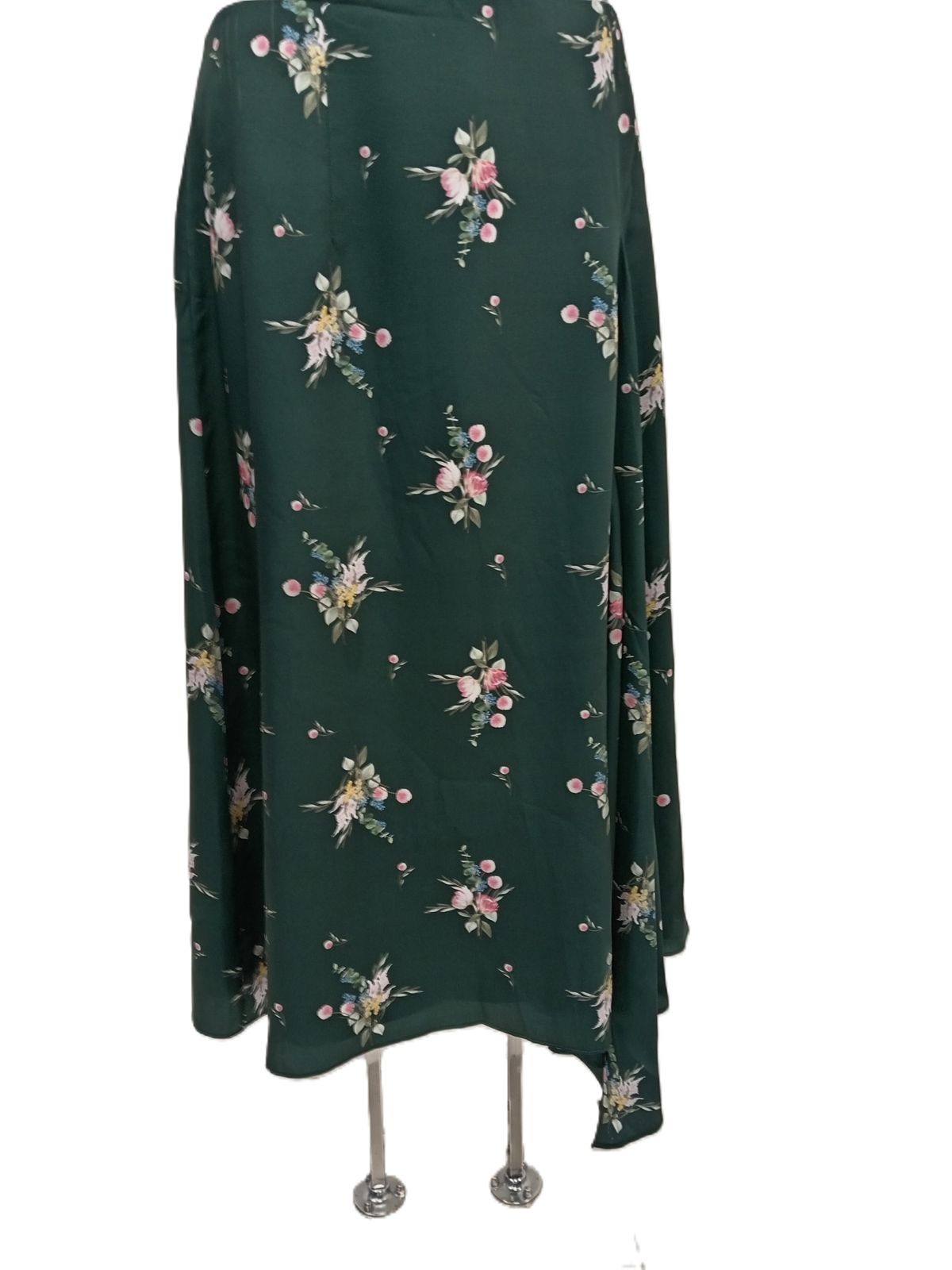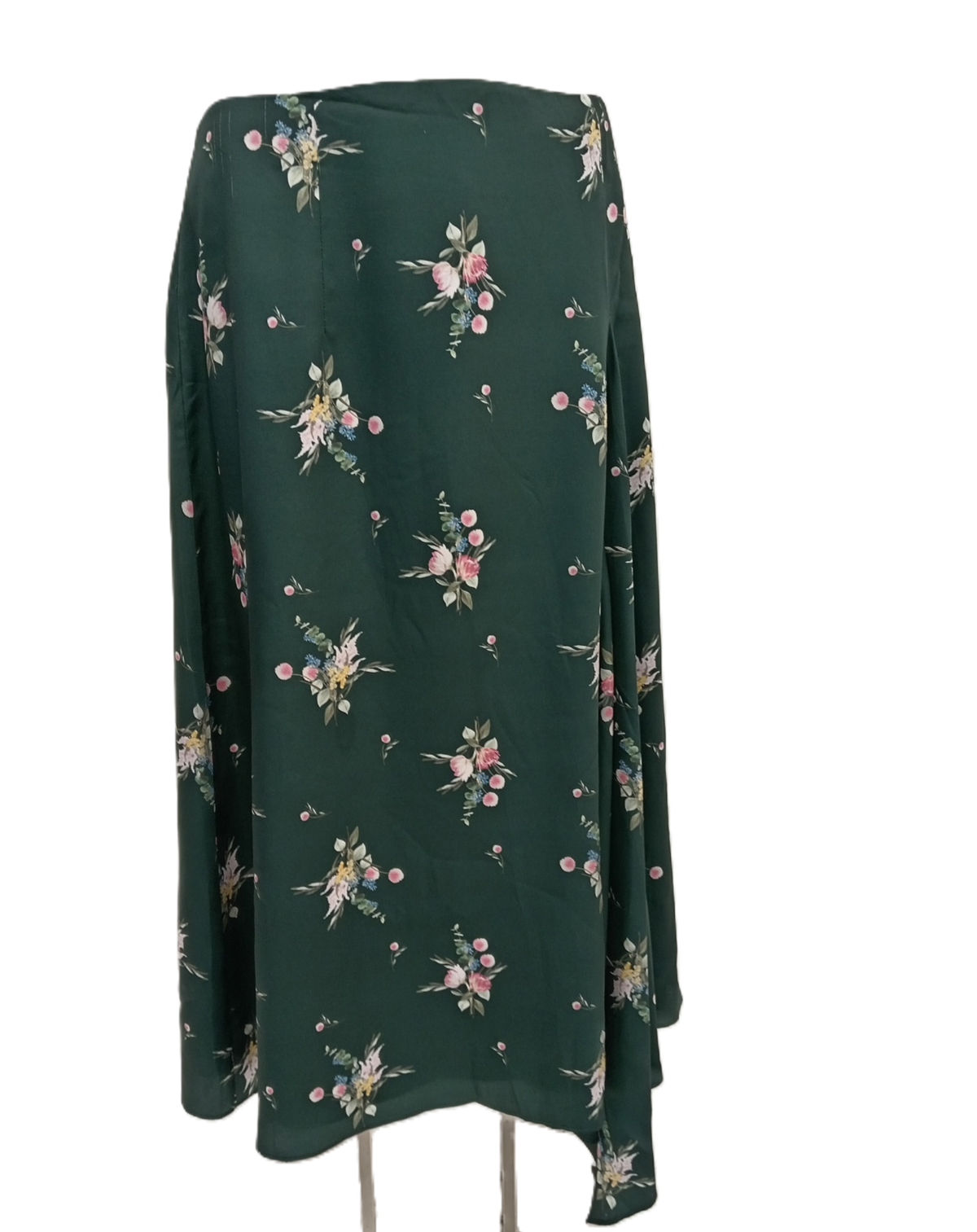 Featuring a vibrant green base adorned with a delicate floral print, this midi-length skirt is both eye-catching and sophisticated. The frilly detailing adds a playful touch, while the flowing silhouette ensures comfort and ease of movement. A fitted waistband completes the design, flattering your figure and offering a secure fit.