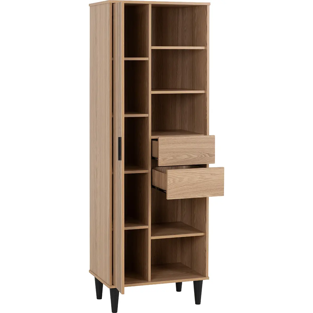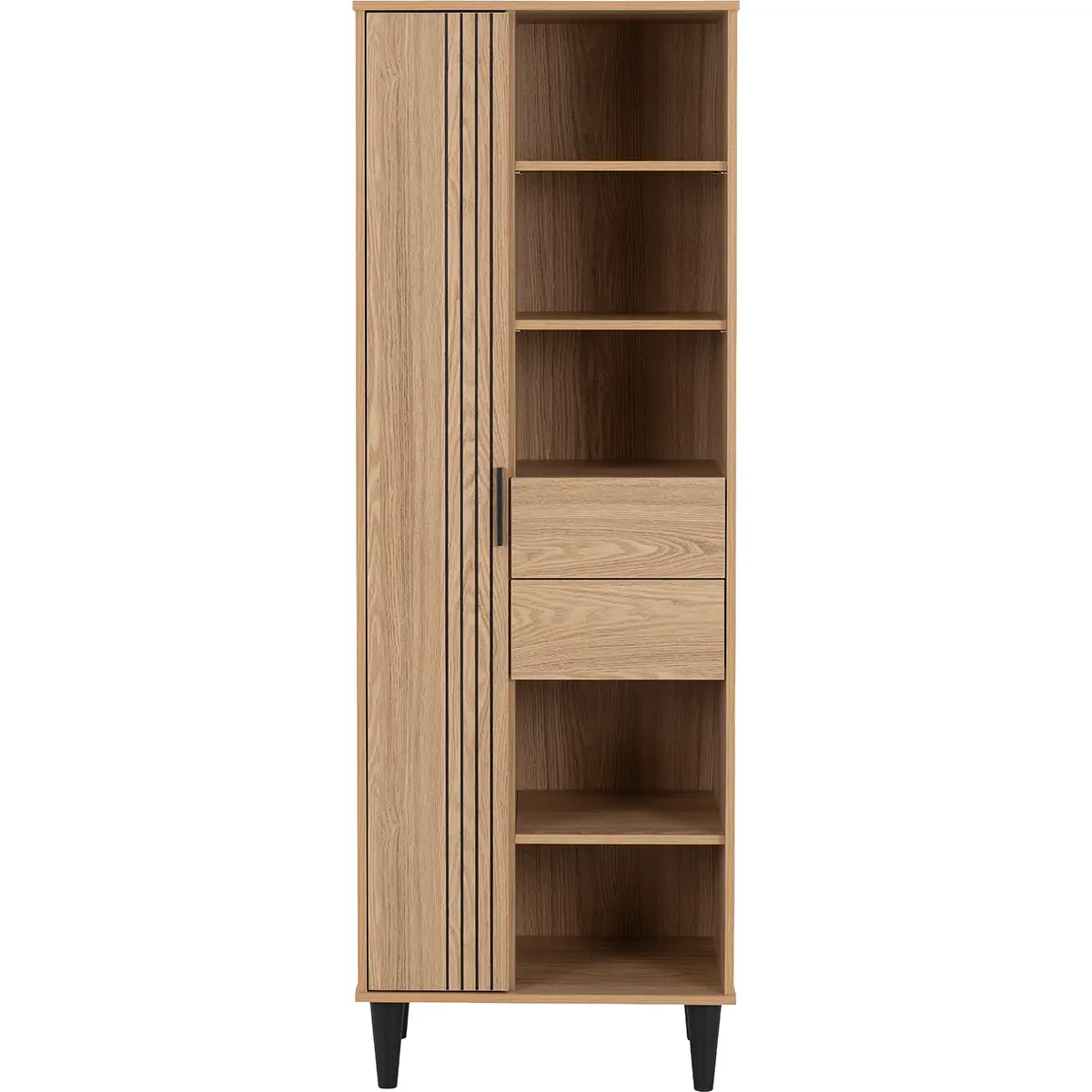 Elevate your home organisation with this sleek and versatile tall storage unit, designed to blend functionality with contemporary charm. Featuring a warm natural oak-effect finish, this piece brings a touch of sophistication to any living space while offering a clever mix of open and concealed storage. The vertical groove detailing on the single door adds a modern accent, creating visual interest without overwhelming your décor. Five spacious open shelves provide the perfect stage for books, decorative accents, or greenery, while two central drawers keep everyday essentials neatly tucked away. The enclosed cabinet section offers additional hidden storage, ideal for maintaining a clutter-free environment. Supported by tapered black legs, this unit not only ensures stability but also introduces a stylish contrast that enhances its overall appeal. Its slim profile makes it an excellent choice for smaller rooms or tight corners, maximising storage without sacrificing floor space. Crafted from durable engineered wood with a realistic oak finish, this piece promises long-lasting quality and timeless style. Supplied flat-packed for convenience, it comes with clear, concise assembly instructions, making setup straightforward and stress-free.