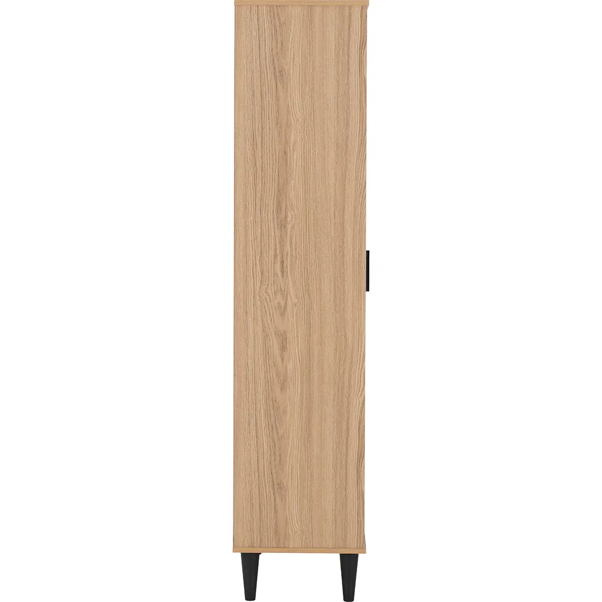 Space-Saving Structure: Tall and narrow profile ideal for compact spaces such as living rooms, home offices, or bedrooms. Sturdy Construction: Made from durable engineered wood with a realistic oak-effect veneer for long-lasting appeal. Elevated Base: Black tapered legs provide stability and add a stylish contrast to the warm wood tones.