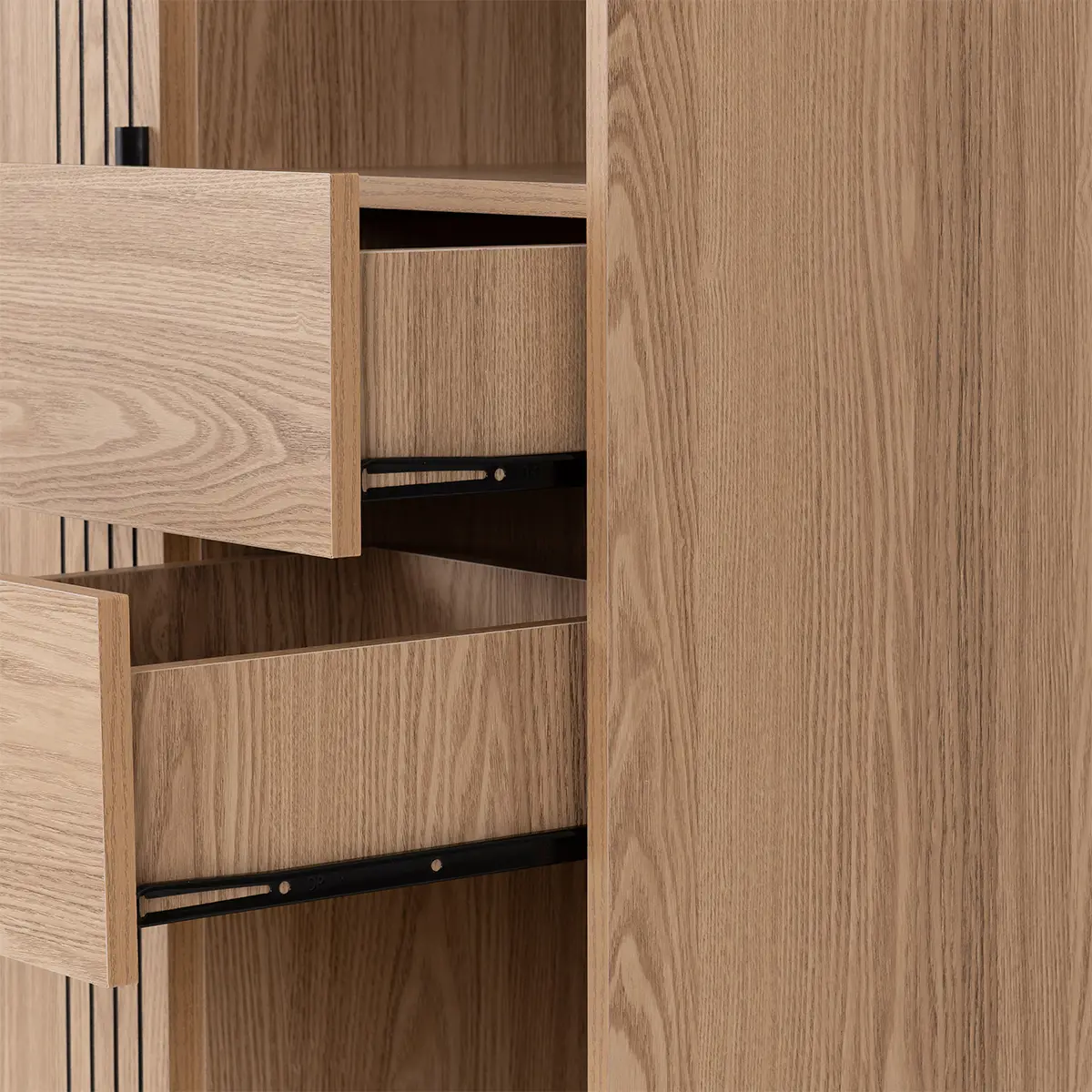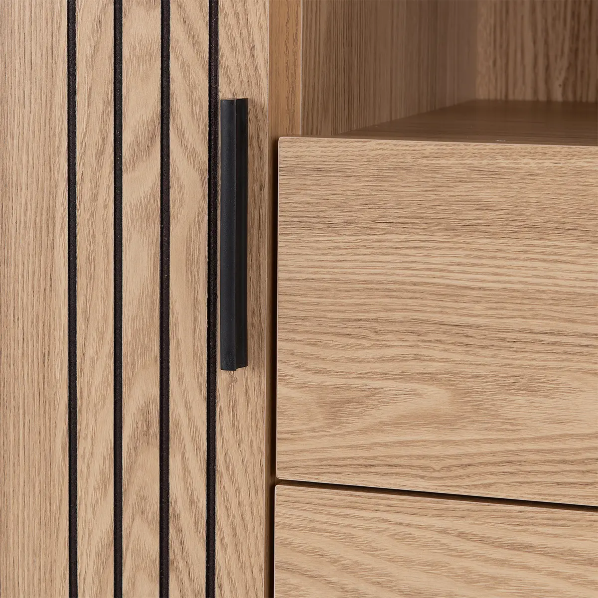 Contemporary Design: Sleek silhouette with natural wood-effect finish and vertical accent grooves for a modern aesthetic.