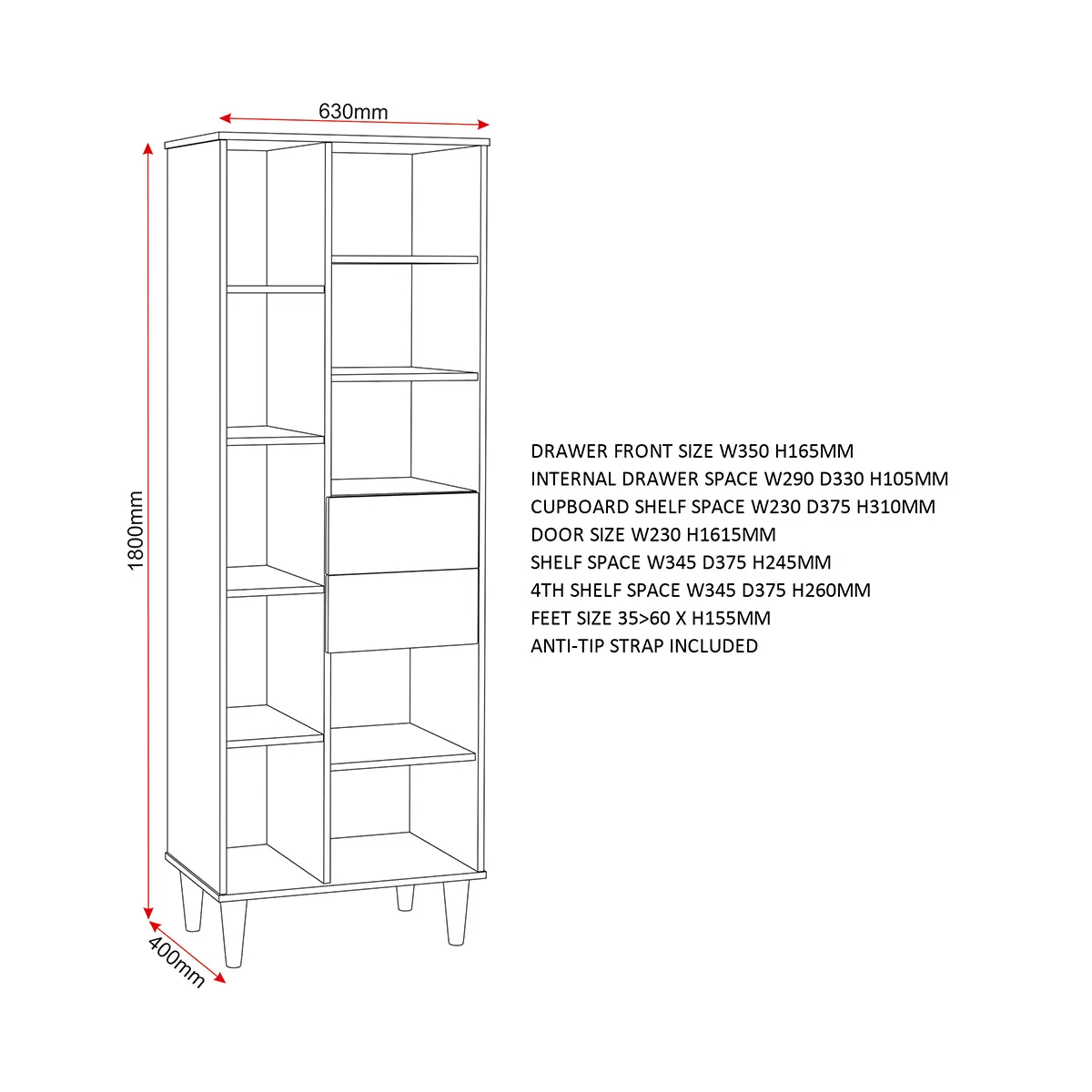 Assembled Dimensions: Width: 63 x Depth: 40 x Height: 180 (cm)