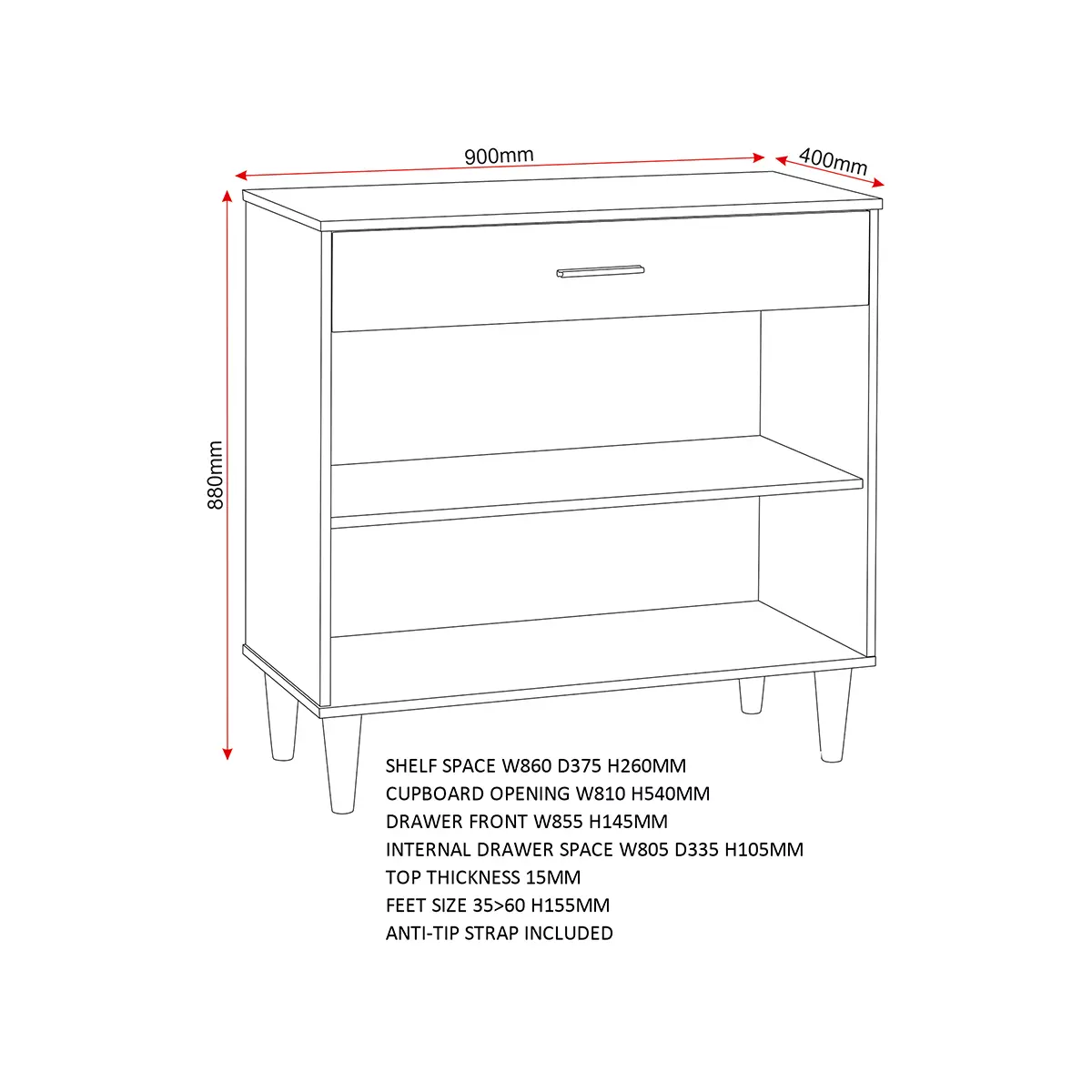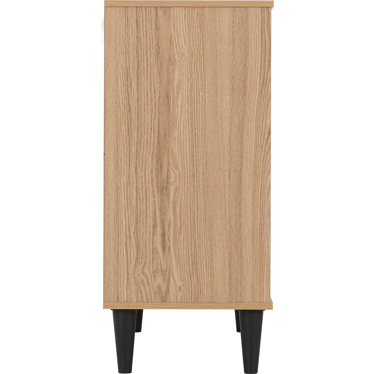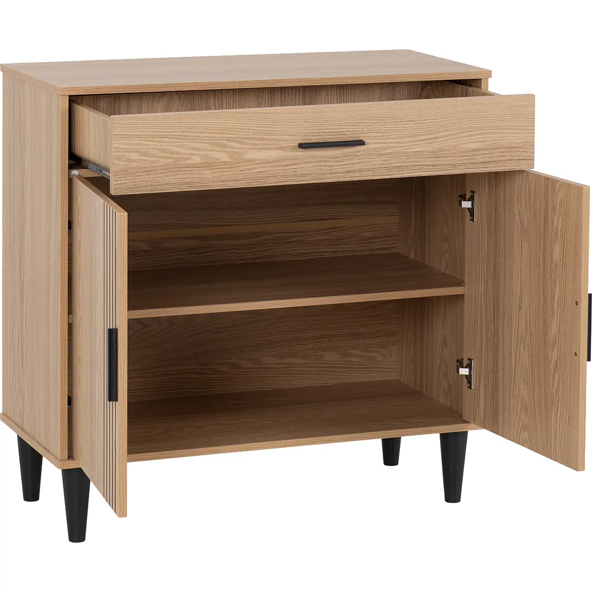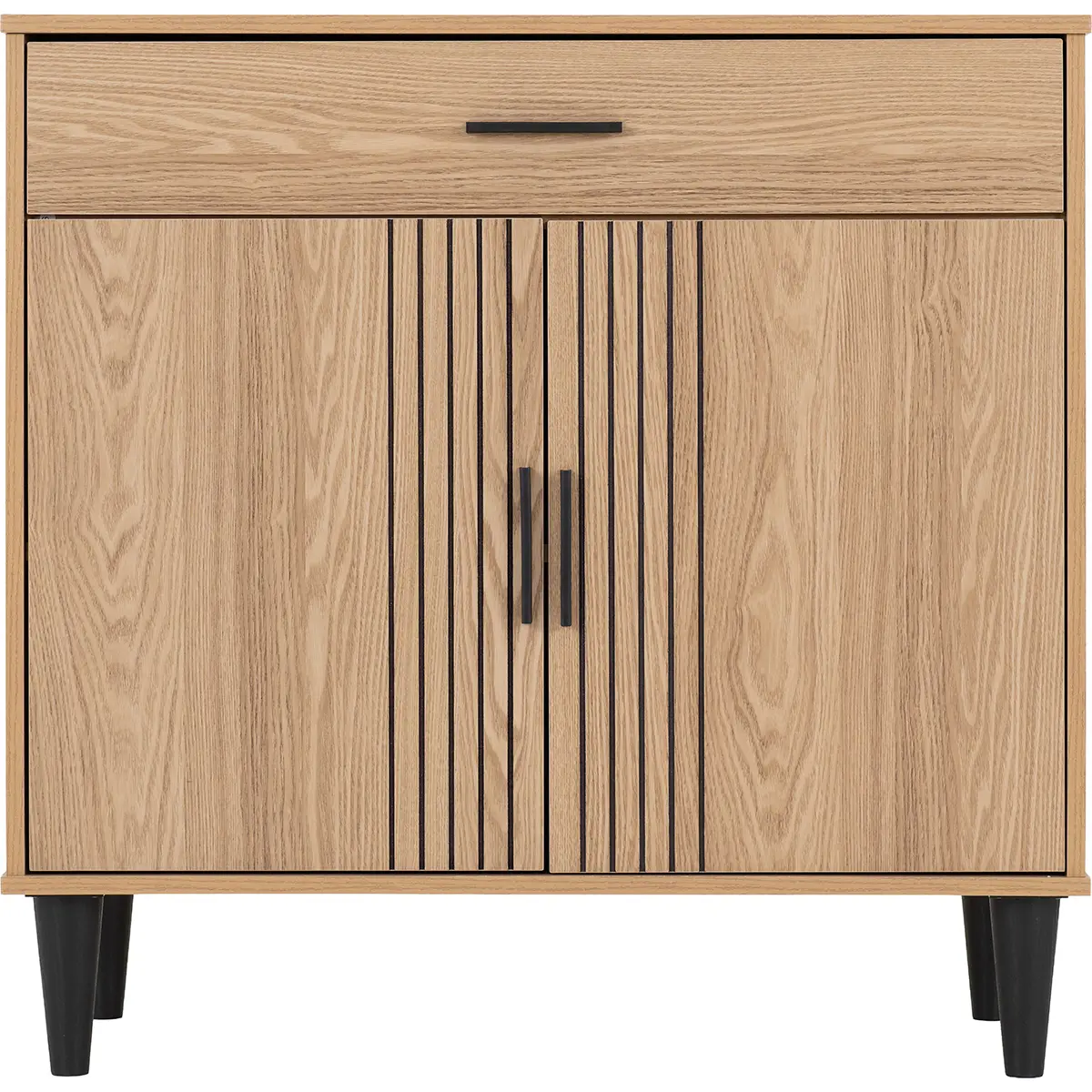 Introduce a touch of modern sophistication to your home with this stylish sideboard cabinet, designed to combine practicality with contemporary elegance. Finished in a warm natural oak effect, this piece features clean lines and subtle detailing that make it a versatile addition to any living space. The front showcases vertical groove accents on the twin doors, creating a striking yet understated design element. A spacious top drawer offers convenient storage for smaller items, while the double-door cabinet below provides ample room for larger essentials, helping you maintain a clutter-free environment. Elevated on sleek black tapered legs, this sideboard delivers stability and a chic contrast that enhances its overall aesthetic. Perfect for living rooms, dining areas, or hallways, its compact footprint makes it ideal for maximizing storage without overwhelming your space. Crafted from durable engineered wood with a realistic oak finish, this piece promises long-lasting quality and timeless appeal. Supplied flat-packed for easy transport, it includes clear, concise assembly instructions for a hassle-free setup.