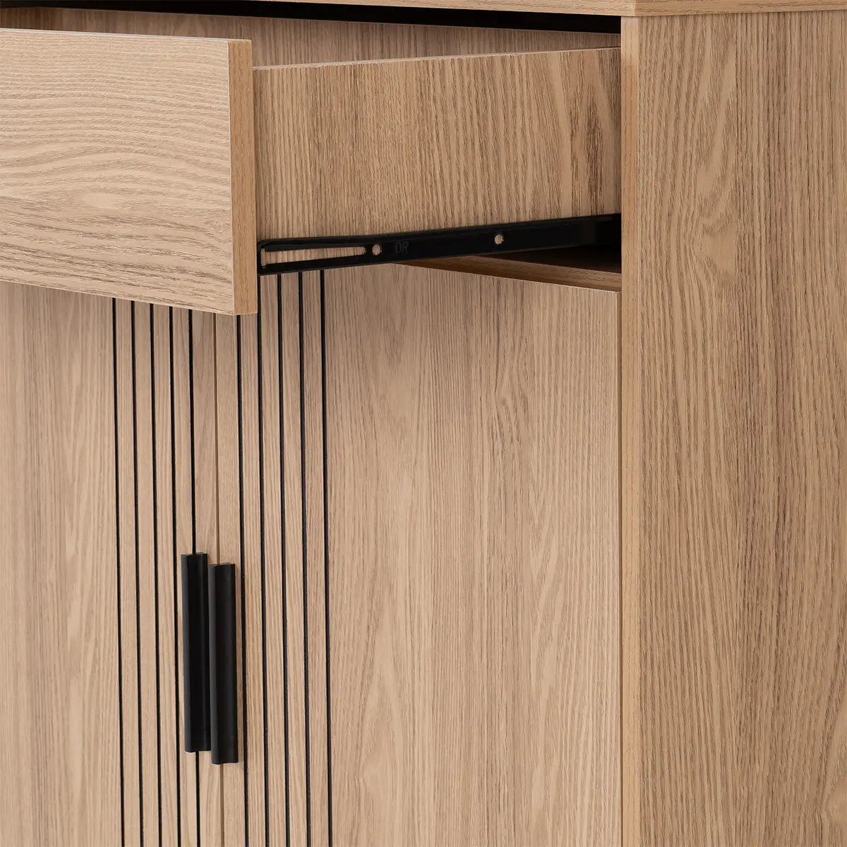 Contemporary Design: Natural oak-effect finish with vertical groove detailing for a modern look. Deliveries are to front door/ground floor of a flat. Smart Storage: One top drawer for smaller items and a two-door cabinet for larger essentials. Smart Storage: One top drawer for smaller items and a two-door cabinet for larger essentials. Space-Saving Profile: Compact design ideal for living rooms, dining spaces, or entryways. Durable Build: Made from sturdy engineered wood with a realistic oak veneer. Versatile Use: Perfect for storing tableware, linens, or everyday household items.