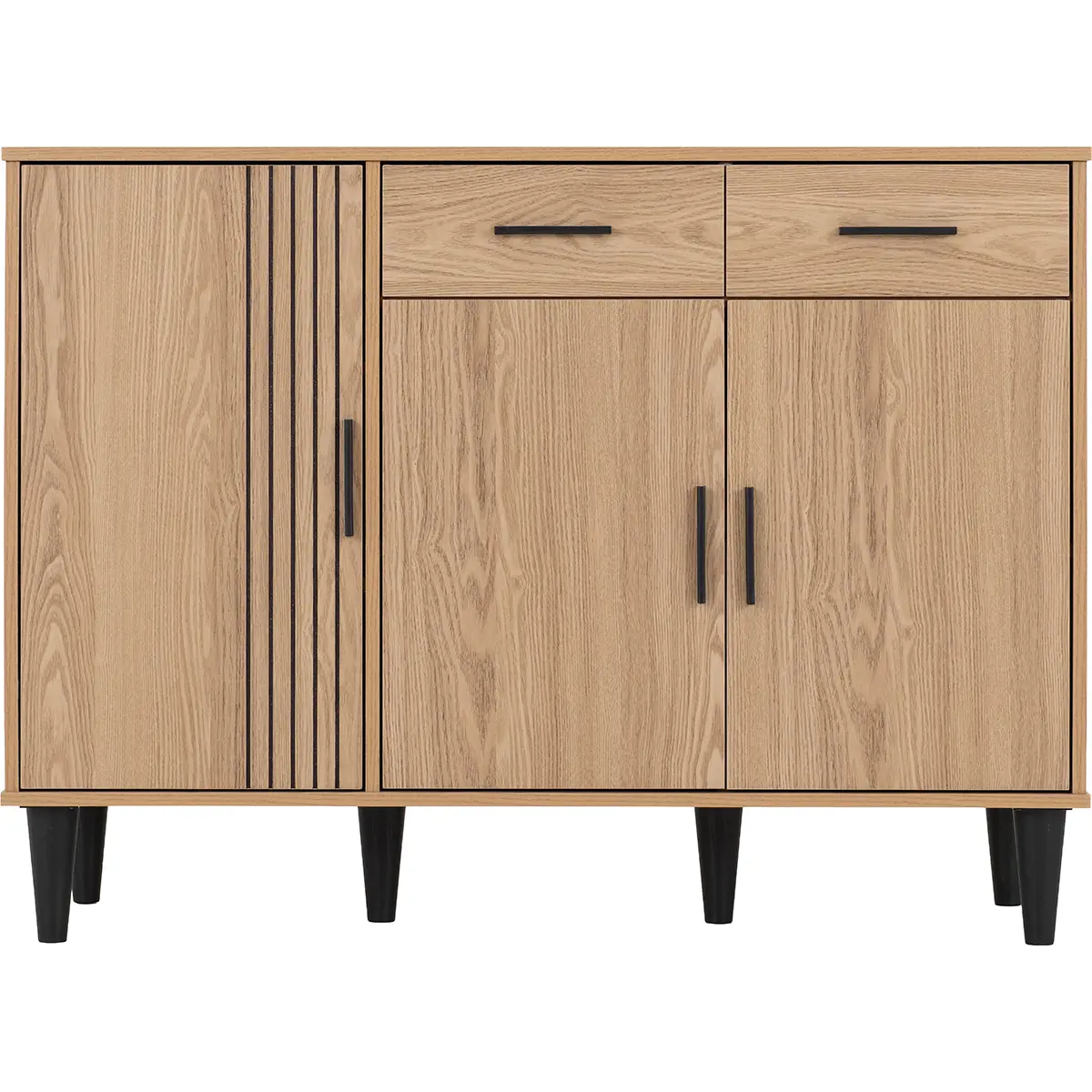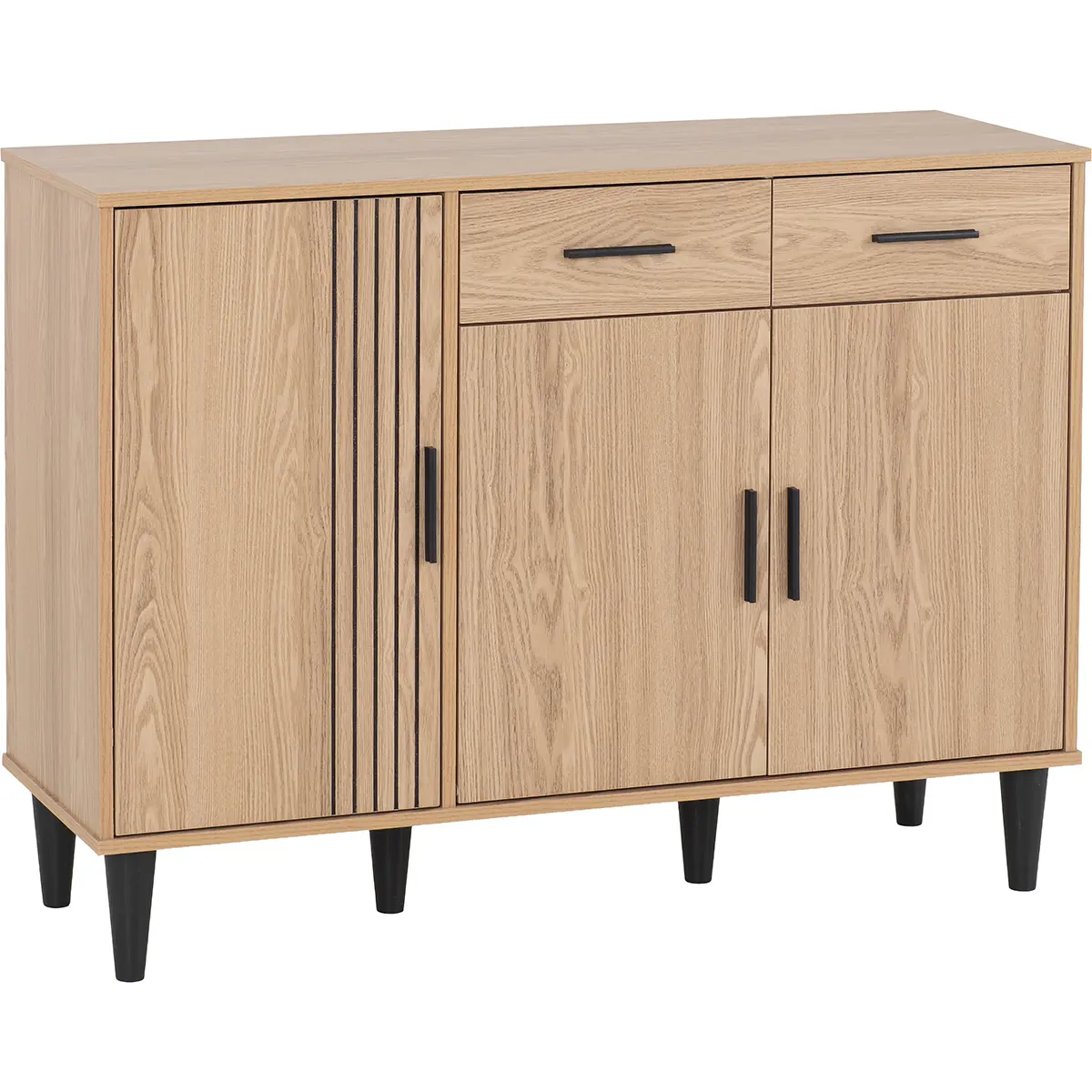 Bring contemporary elegance and practical storage into your home with this beautifully designed sideboard. Finished in a warm natural oak effect, this piece combines clean lines with subtle detailing for a modern yet timeless look. The front features a striking combination of vertical groove accents and smooth panels, creating visual interest without overwhelming your space. Two spacious drawers provide convenient storage for smaller items, while the three-door cabinet below offers generous room for larger essentials, making it perfect for organising dining ware, linens, or everyday household items. Elevated on sleek black tapered legs, this sideboard delivers stability and a stylish contrast that enhances its overall appeal. Ideal for living rooms, dining areas, or hallways, its balanced proportions make it a versatile choice for any home. Crafted from durable engineered wood with a realistic oak finish, this piece promises long-lasting quality and effortless style. Supplied flat-packed for easy transport, it includes clear, concise assembly instructions for a stress-free setup.