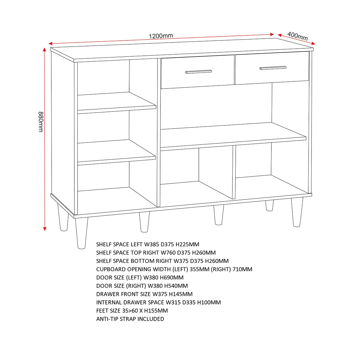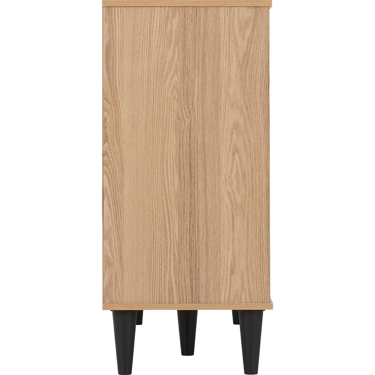Modern Design: Natural oak-effect finish with vertical groove detailing for a contemporary aesthetic. Generous Storage: Two drawers for smaller items and a three-door cabinet for larger essentials. Space-Saving Profile: Ideal for living rooms, dining spaces, or entryways. Durable Build: Made from sturdy engineered wood with a realistic oak veneer. Versatile Use: Perfect for storing tableware, linens, or everyday household items.