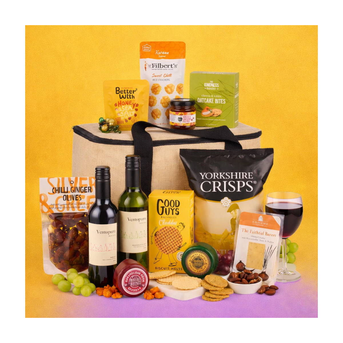 Inside, you’ll find a delicious pairing of Ventopuro Merlot and Ventopuro Sauvignon Blanc to complement a trio of artisan cheeses – Mouse House Caramelised Onion Cheddar, Croom Cheese Faithful Baron Cheddar with Worcester Sauce & Shallots, and Mouse House Vintage Cheddar. To complete the experience, there’s a tempting array of savoury nibbles including Yorkshire Crisps Sea Salt, The Kindness Bakery Cheese & Chive Oatcake Bites, Silver & Green Chilli Ginger Olives, and Fruits of the Forage Tomato & Tamarind Chutney. A selection of crackers, nuts, and biscuits ensures every mouthful is bursting with flavour.