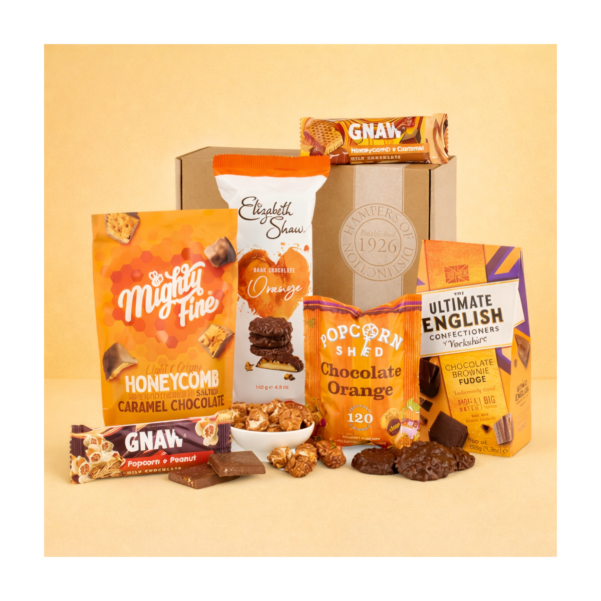 Inside, they’ll savour melt-in-the-mouth Ultimate English Chocolate Brownie Fudge, crunchy Gnaw Peanut & Popcorn Milk Chocolate, and Mighty Fine Salted Caramel Chocolate Honeycomb for that perfect sweet-salty hit. Layers of flavour continue with Popcorn Shed Chocolate & Orange, Elizabeth Shaw Dark Chocolate Orange Biscuits, and a Gnaw Honeycomb & Caramel Chocolate Bar – all beautifully presented in a charming Kraft gift box, ready to surprise and delight.