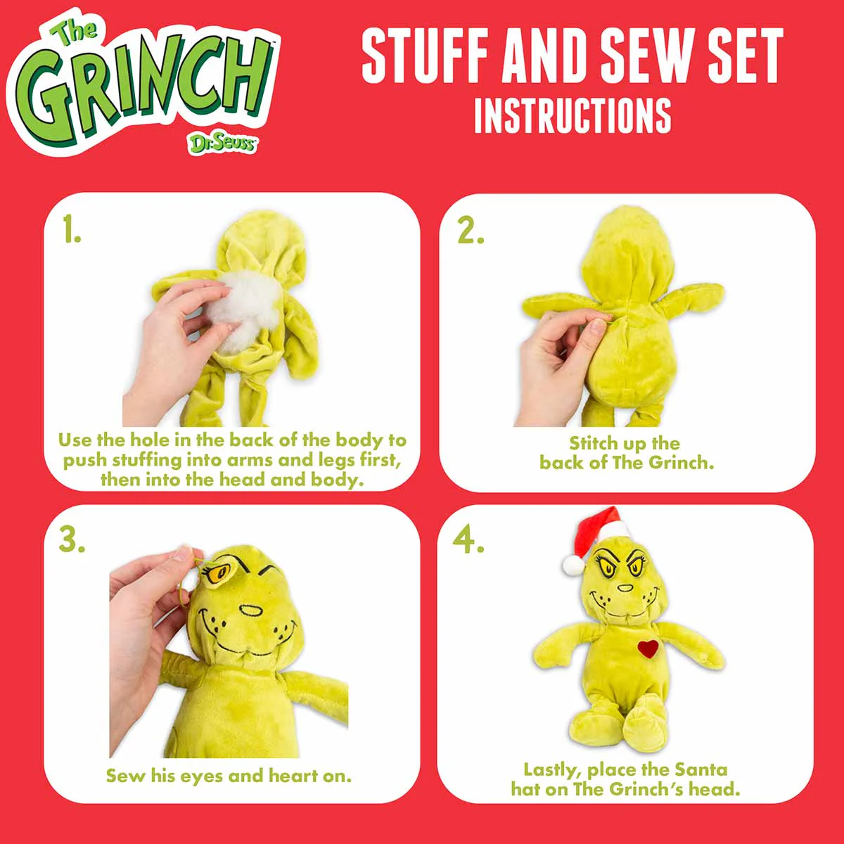 • Includes Grinch stuff, sew, Santa hat, press on heart, press on eyes, stuffing