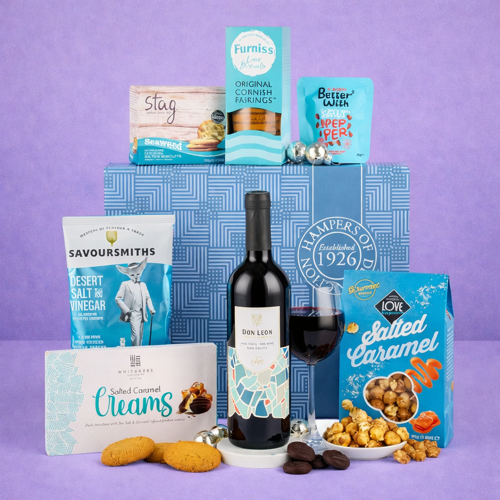 From buttery biscuits and salted caramel popcorn to crunchy almonds and artisan crisps, every item is carefully selected to pair beautifully with the Don Leon red wine. Packed in a sleek gift box, this red wine hamper brings festive indulgence with a refined twist.
