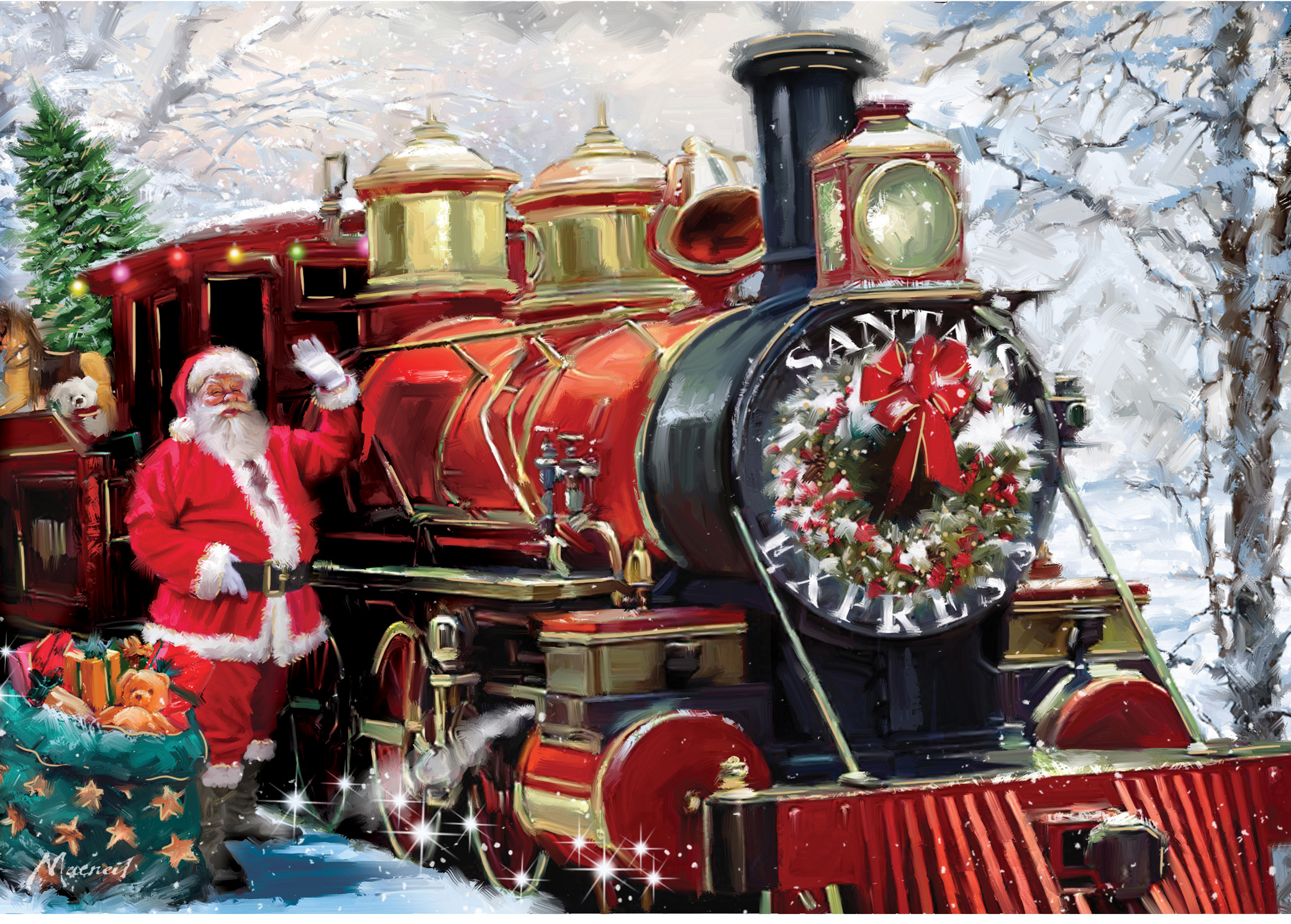 All aboard Santa’s Express! This beautifully illustrated Christmas card captures Santa waving beside his gleaming red steam train, ready to deliver gifts through a snowy winter wonderland. Adorned with a festive wreath and sparkling details, this heartwarming design brings the excitement and magic of Christmas Eve to life.