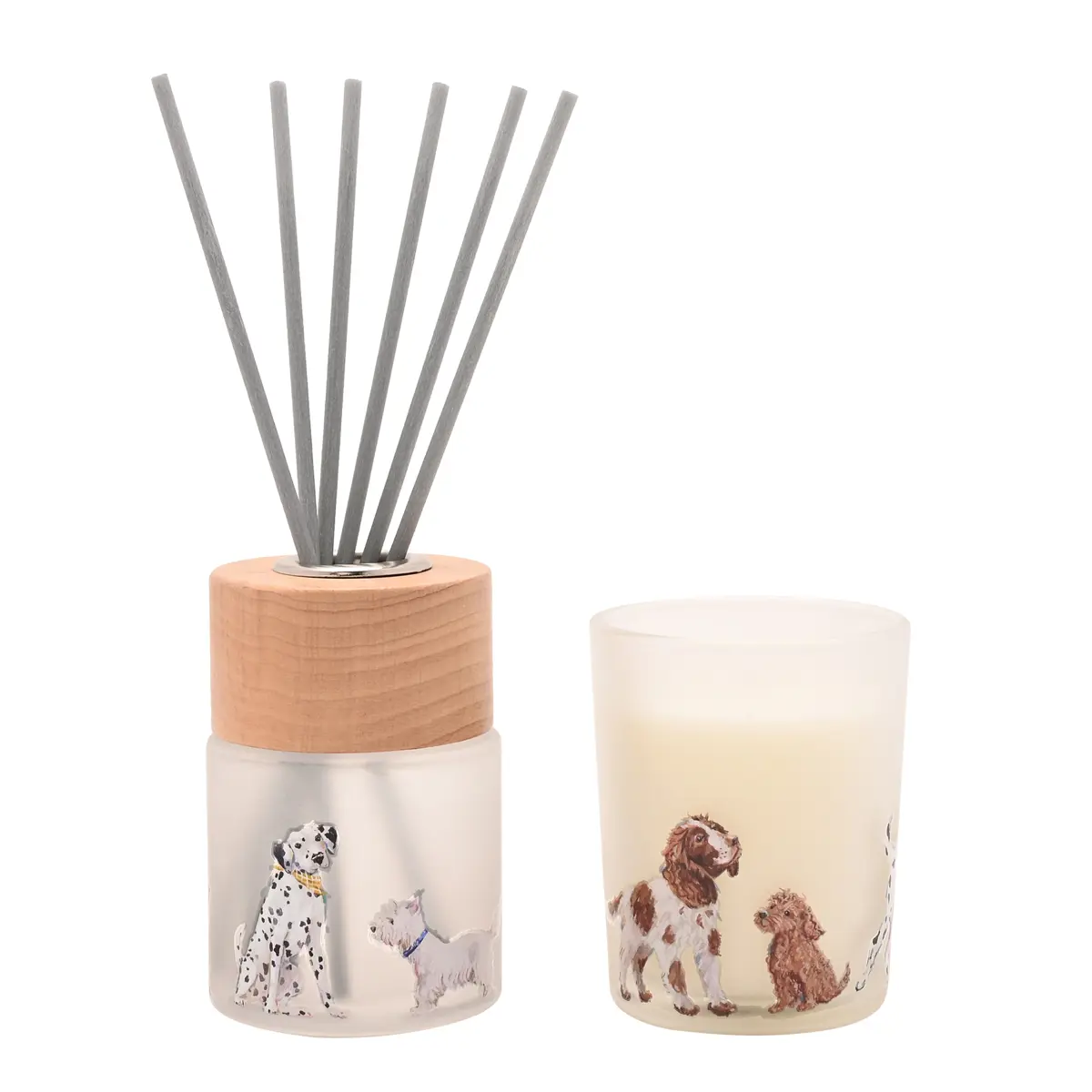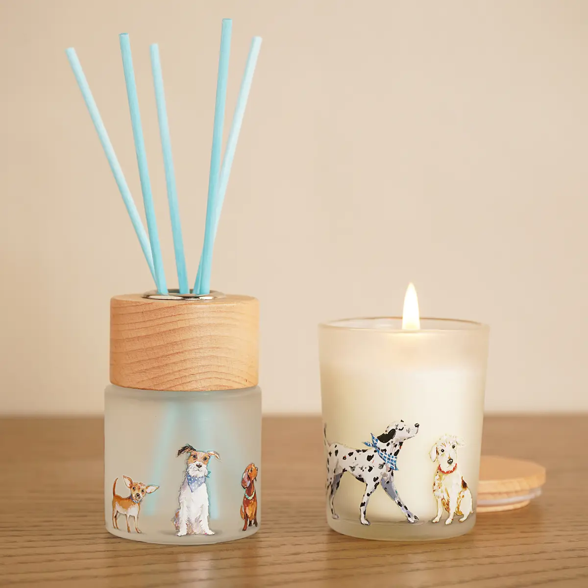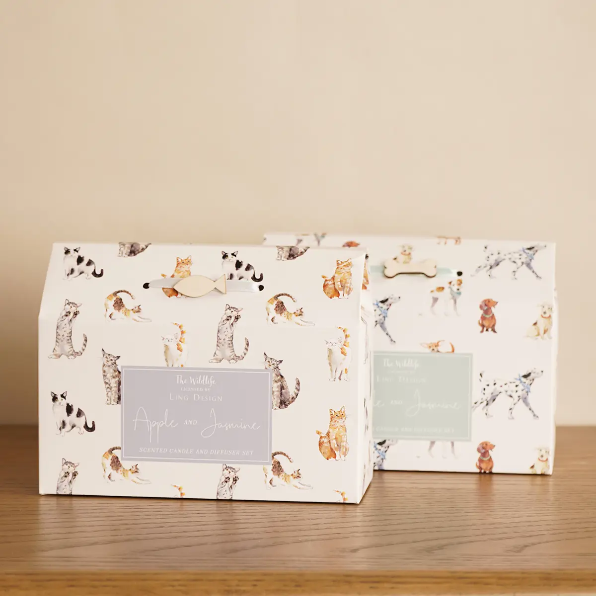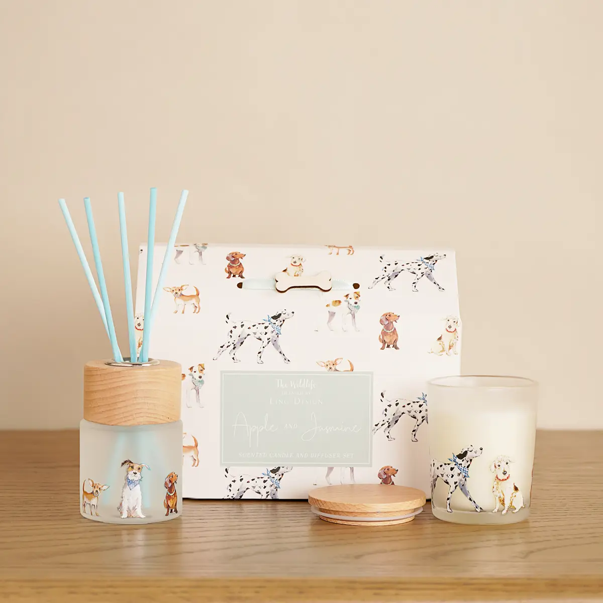 Inside you will find a fragrant candle and matching diffuser in a fresh apple and jasmine blend. Featuring glass vessels adorned with whimsical dog motifs, a wooden lidded container and reusable reeds, this decorative duo combines style and practicality, making it a thoughtful gift or a lovely treat for yourself.