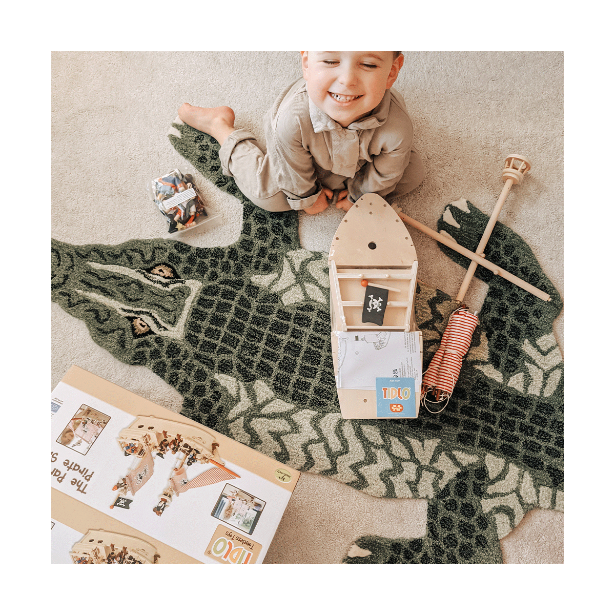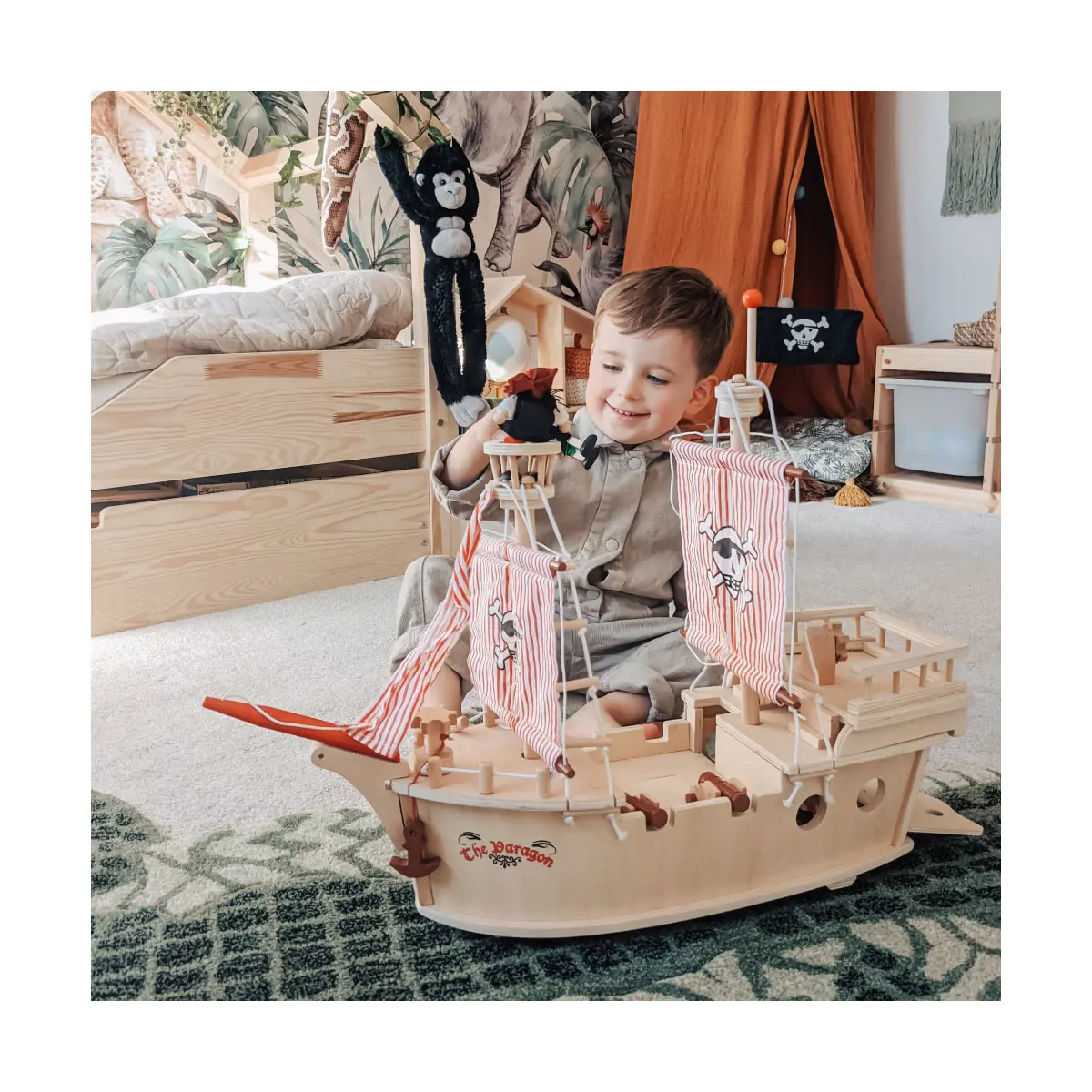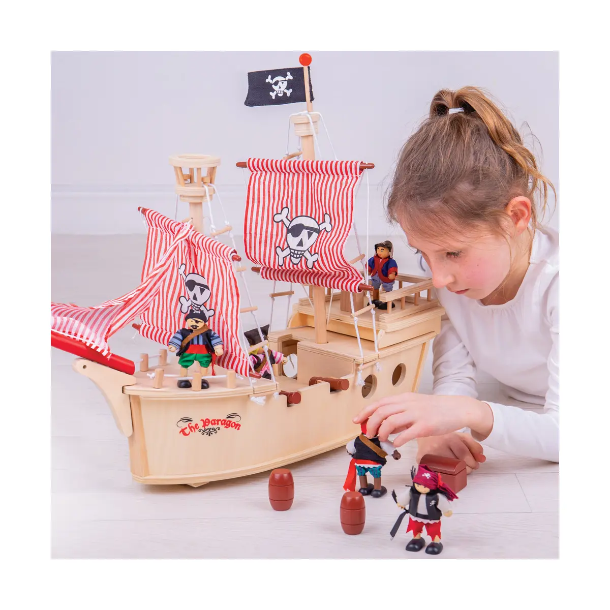 product features: Wooden pirate ship with a captain, pirates, a treasure chest, cannons, barrels, an anchor and more Hidden wheels to help the ship across the floor Made from high quality, responsibly sourced materials