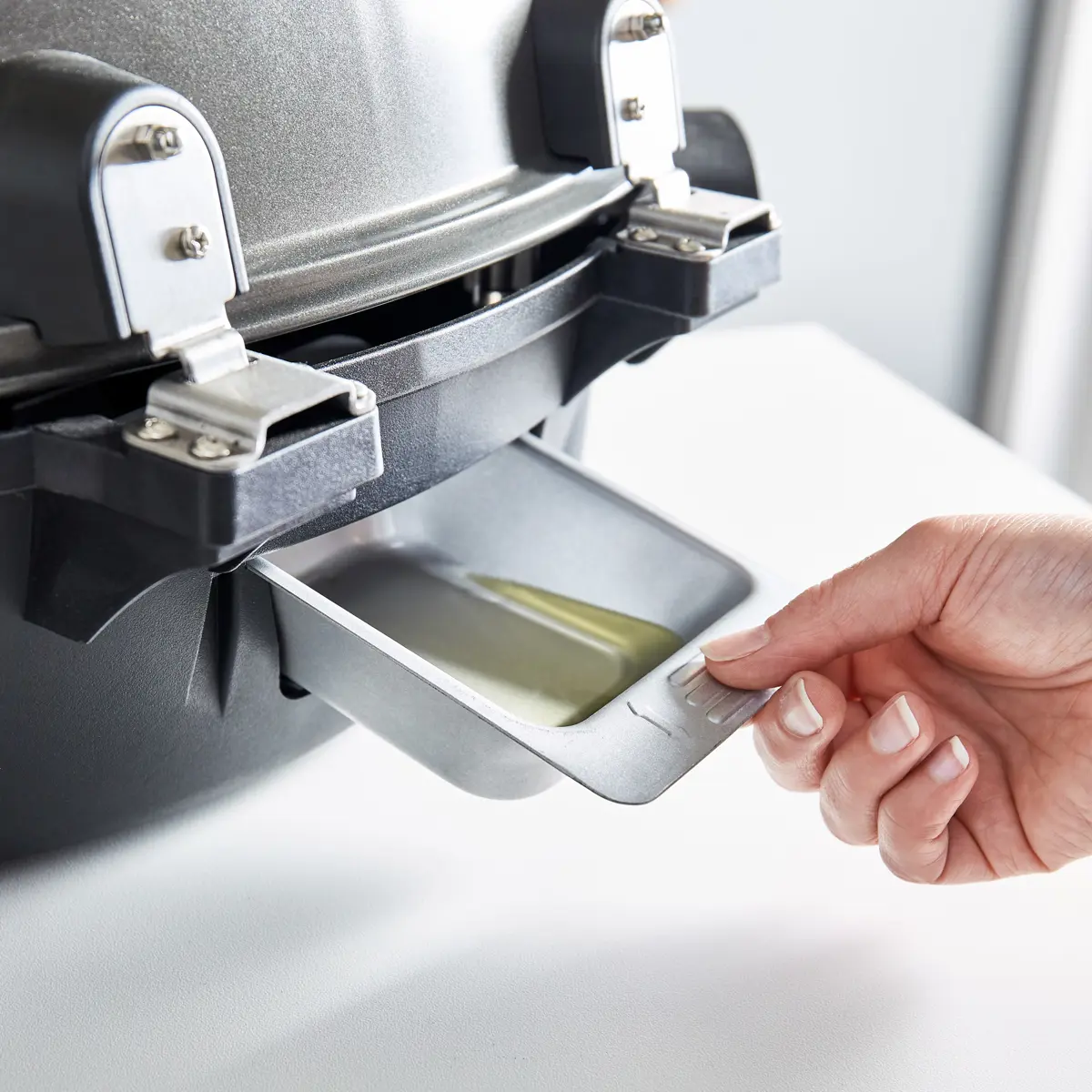 Grease tray for excess fat - Cool touch handles and high domed lid