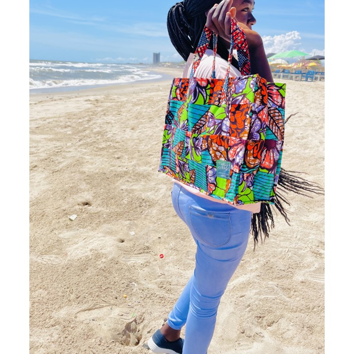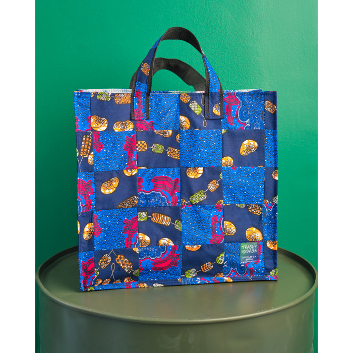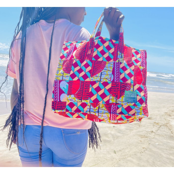 This sturdy tote bag is designed to withstand daily wear and tear. Each bag is handmade in Ghana from over 62 pieces of upcycled materials, including post-consumer plastic waste.