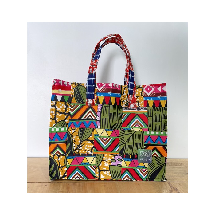 Introducing the Trashy Bags Africa Upcycled Tote Bag with an Off-Cut Fabric Outer and Plastic Waste Lining - the ultimate sustainable solution for individuals who crave both fashion and eco-consciousness in their everyday carry-all. Expertly crafted with care and a deep commitment to the environment, this tote bag offers a perfect blend of style, versatility, and sustainability.