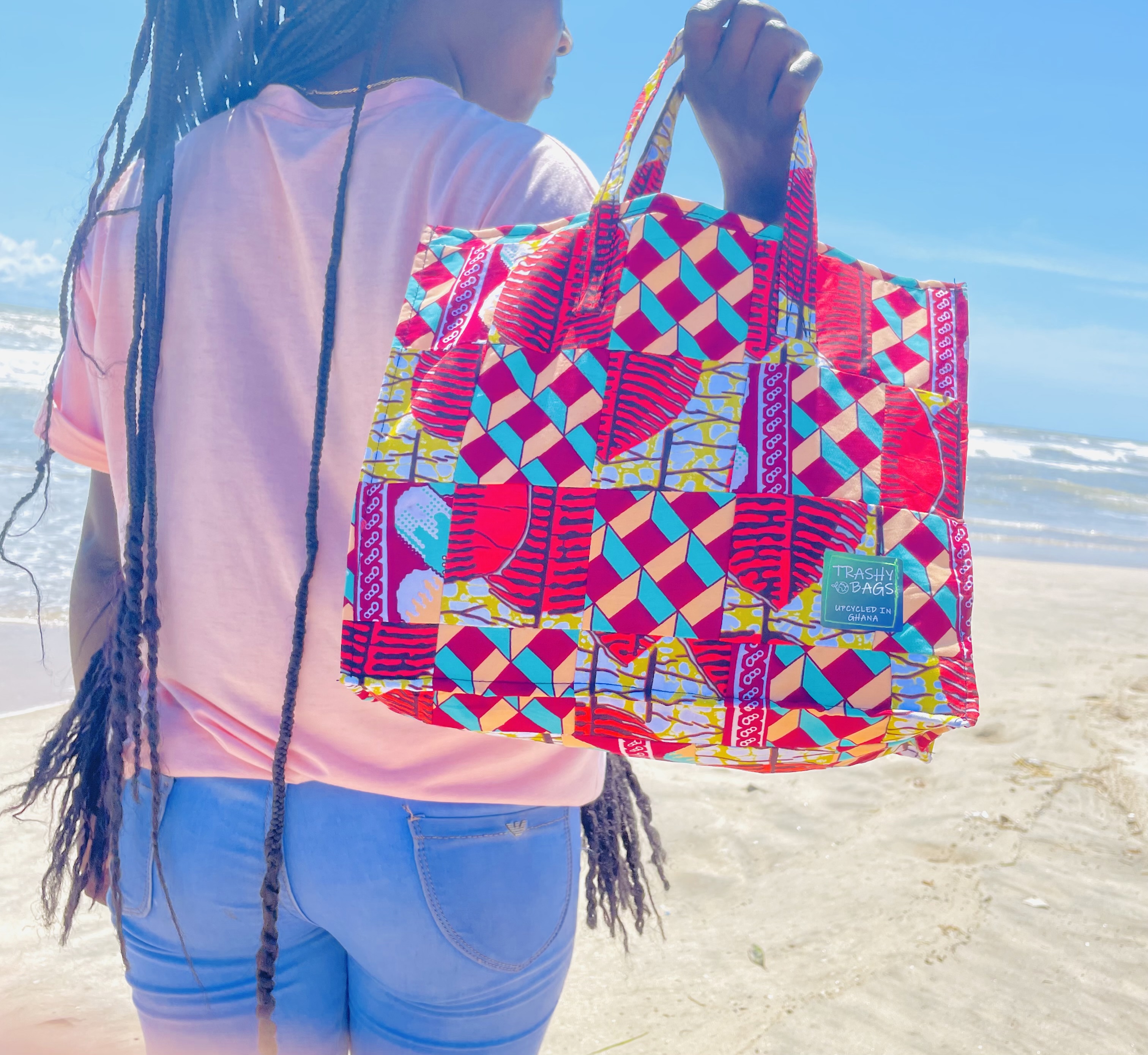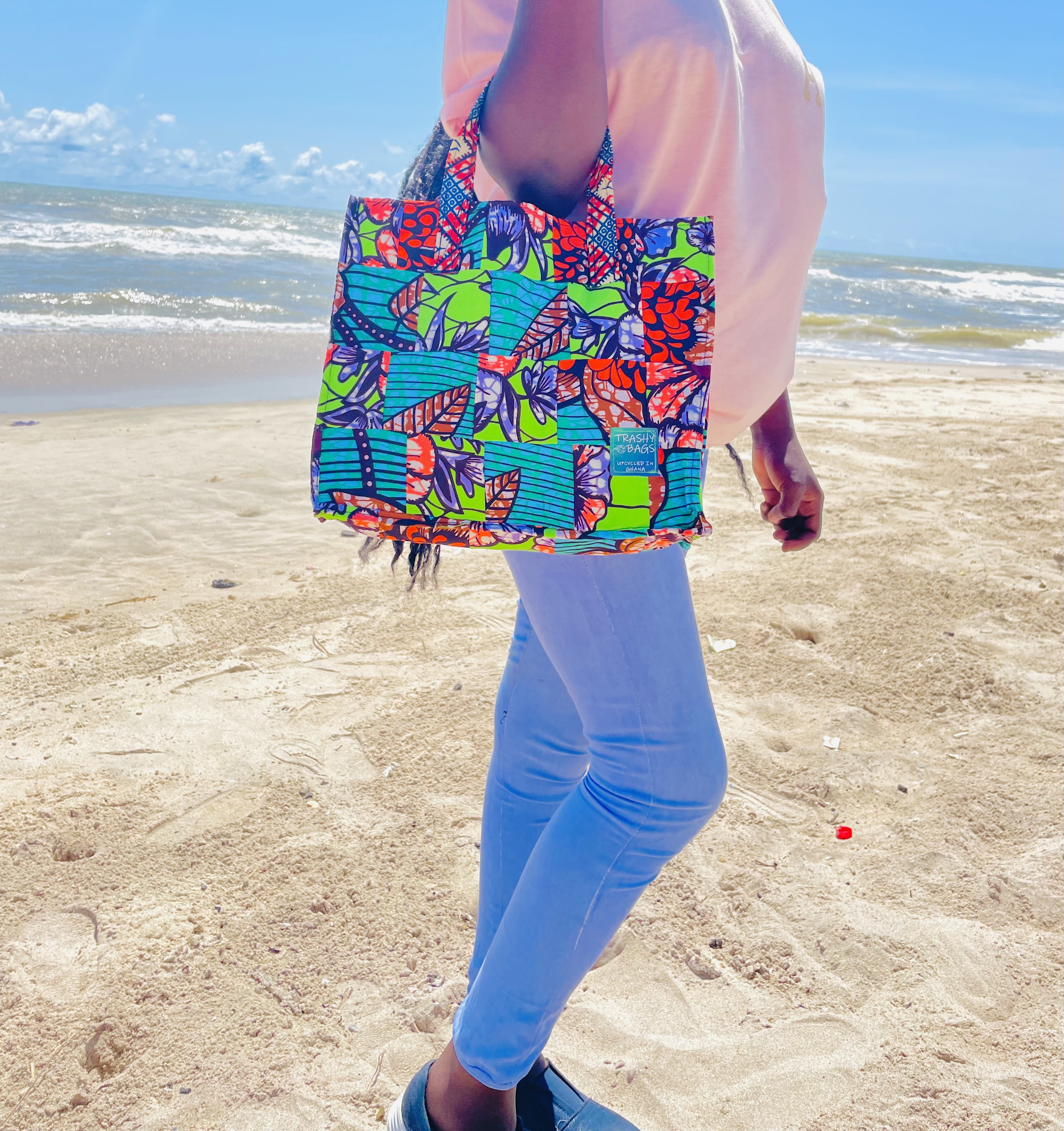 The Trashy Bags Africa Upcycled Tote Bag, measuring a roomy 34 x 32cm, provides ample space for your everyday essentials and more. Its classic design ensures that you can carry it to work, school, or shopping while making a fashion statement.