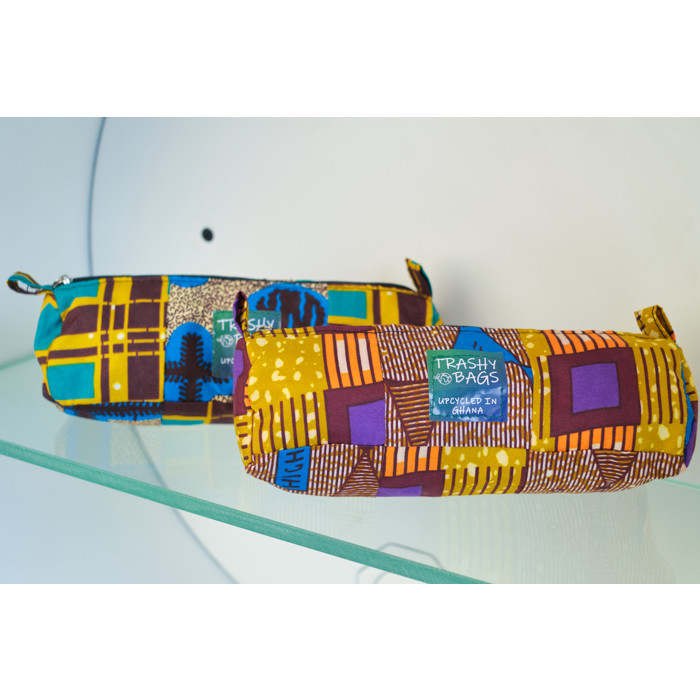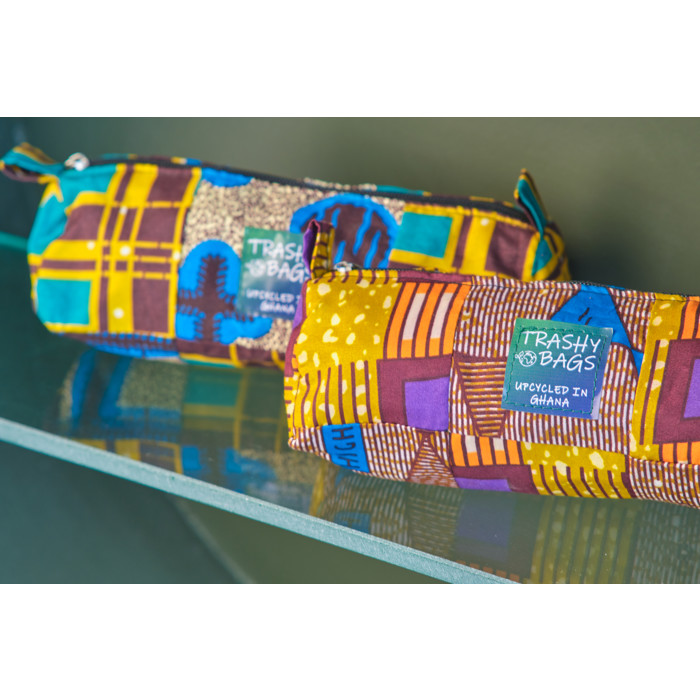 Introducing the Trashy Bags Africa Upcycled Pencil Case with an Off-Cut Fabric Outer and Plastic Waste Lining - the sustainable solution for individuals of all ages seeking both style and eco-consciousness in their everyday organisation. The Trashy Bags Africa Upcycled Pencil Case is not just any pencil case; it's a statement piece. Each Pencil Case is handcrafted in Ghana with an innovative combination of materials. The outer layer is made from off-cut fabric, minimising textile waste, while the interior lining consists of upcycled plastic waste. This pencil case is built to withstand the rigors of daily use. Its robust construction ensures that it can handle your pens, pencils, markers, and other stationery essentials, making it an essential companion for school, work, or creative endeavours. By choosing this pencil case, you're not just organising your stationery; you're actively participating in the fight against plastic pollution and supporting sustainable practices.