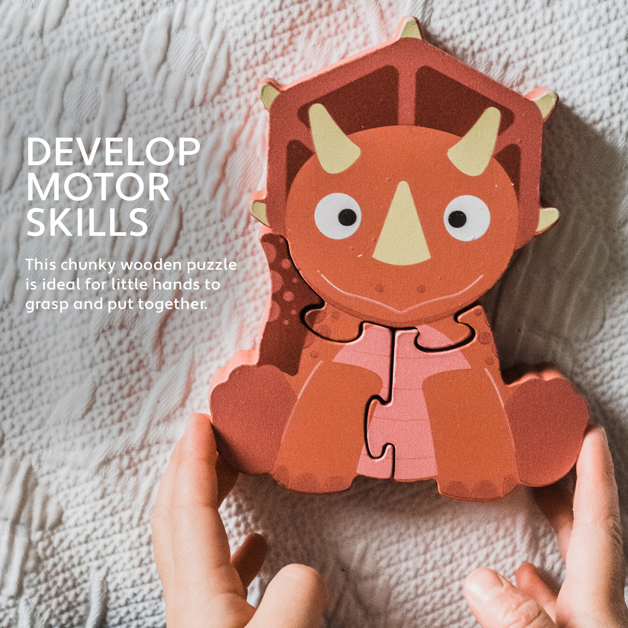 Bring the prehistoric era to life with this adorable chunky wooden Triceratops Puzzle! Perfect for hours of puzzling fun, while also learning fine motor skills. Put the pieces together for a roaring good time! Painted using bright colours and simple for a toddler to put together. This puzzle can help with colour recognition, fine motor skills as well as developing stories and imagination with the completed character.