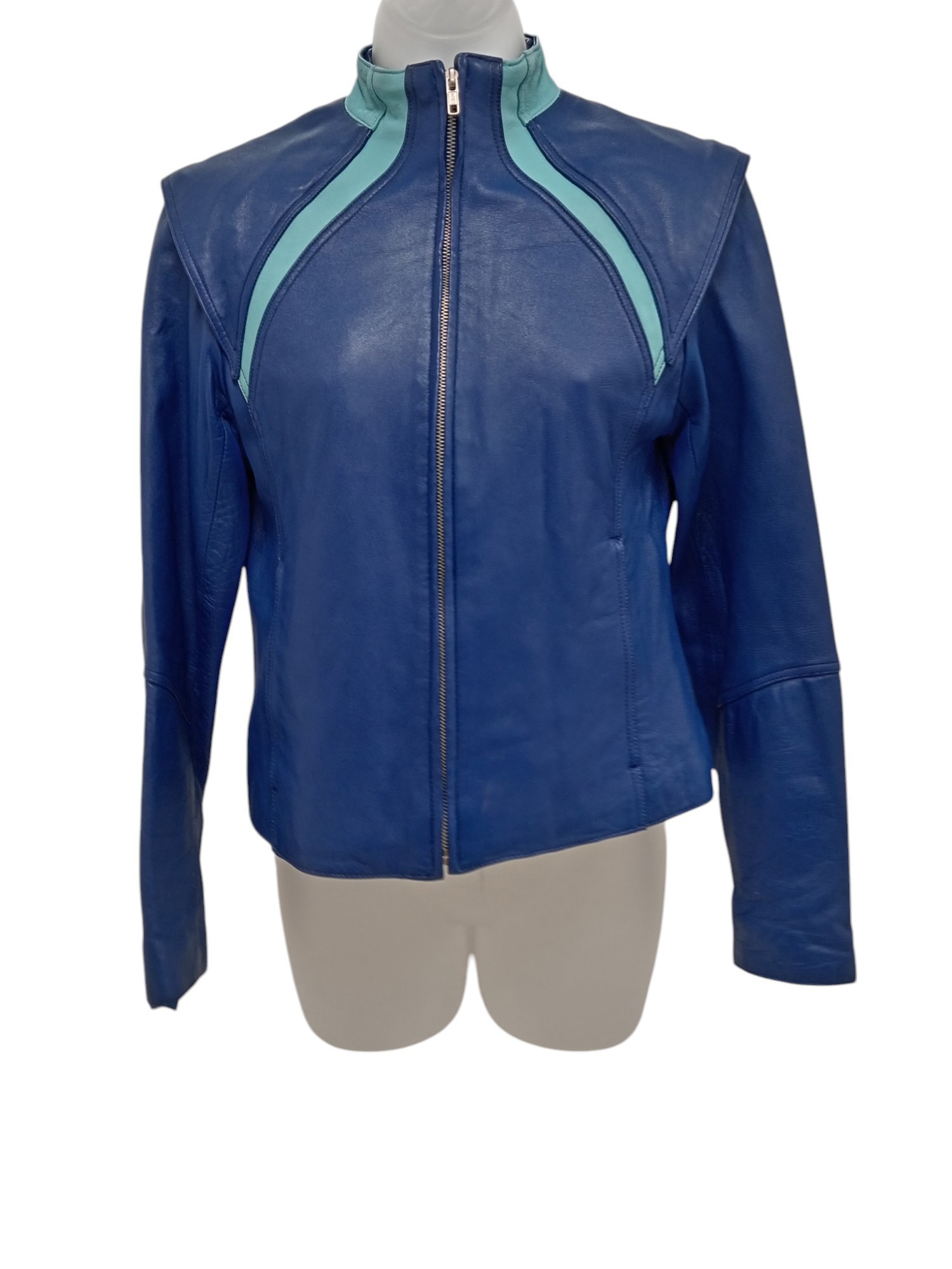 Make a bold statement with this vintage Tristan Webber leather jacket. Crafted from genuine blue leather, this jacket exudes timeless elegance and edgy sophistication. The zip-up front and sleek silhouette create a flattering fit, while the high-quality leather ensures lasting wear.