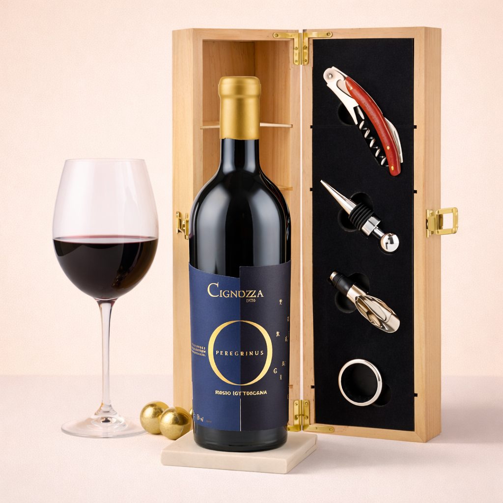 Tuscan Wine Gift Box – a true taste of Italy’s renowned winemaking heritage. This Cignozza Peregrinus Toscana offers rich, full-bodied flavours with a refined finish, perfect for savouring over a special meal or gifting to a wine enthusiast. Presented in an elegant wooden box complete with a wine stopper and pourer, it combines both style and practicality for a memorable gift experience.