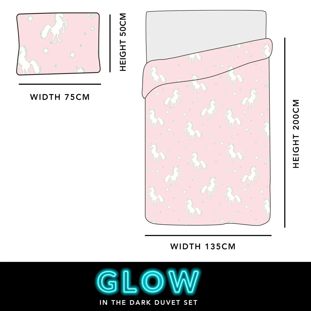 Transform your child's bedtime into a magical adventure with our glow-in-the-dark unicorn duvet set. Simply expose the duvet to light for 30 minutes to activate the enchanting glow and watch their face light up with joy.