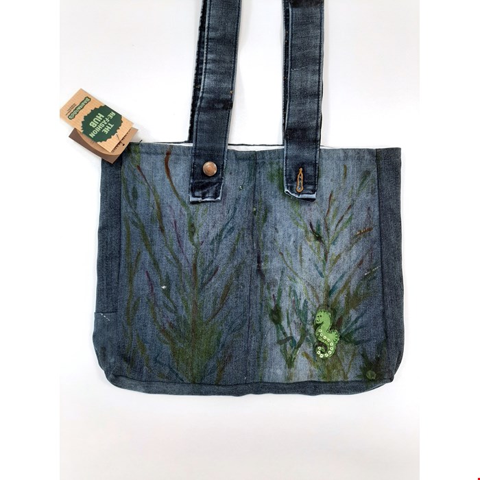 Bring ocean-inspired charm to your everyday accessories with this Upcycled Handmade Blue Denim Tote Bag, re-fashioned from mixed textiles. Featuring hand-drawn seaweed details and a delicate seahorse motif, it’s a practical yet creative piece that celebrates both sustainability and unique design.