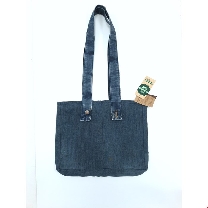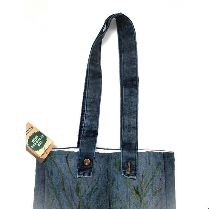 • Handmade tote bag crafted from repurposed denim.