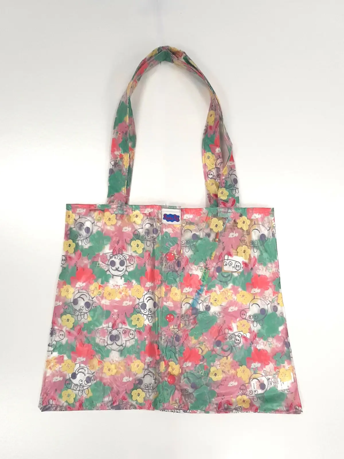 Bring a playful and practical twist to your accessories with this Upcycled Peppa Pig Tote Bag, re-fashioned from an old raincoat. Featuring a clear waterproof material with patterned design, it’s a fun and sustainable carryall that’s perfect for everyday use, shopping trips, or family outings.