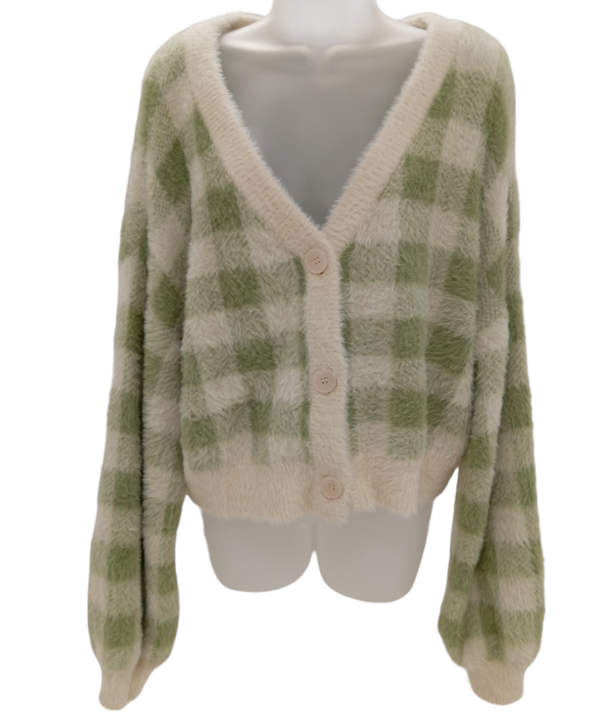 This cardigan features a chic green checked pattern, bringing a pop of color and pattern to your ensemble. The cropped length adds a trendy twist, making it an ideal pairing with high-waisted jeans or skirts. The soft, plush texture ensures comfort, while the button-up front allows for versatile styling options. Ribbed cuffs and hem provide a snug fit, enhancing the cardigan’s cozy appeal.