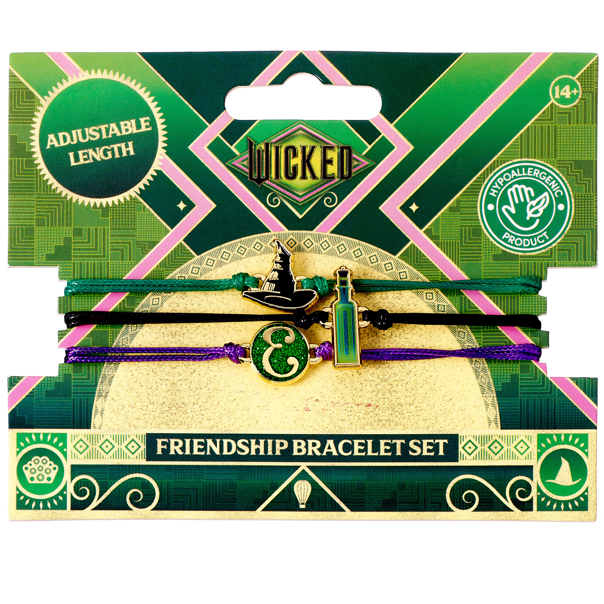 Celebrate the strength, individuality and spirit of Elphaba with this striking Wicked Elphaba Friendship Bracelet Set. Designed with meaningful charms including her signature hat, elixir bottle and initial ‘E’, this officially licensed accessory captures the essence of the misunderstood hero. A perfect gift for fans of Wicked, the adjustable cord bracelets are both stylish and symbolic.