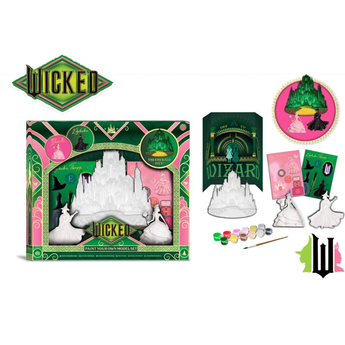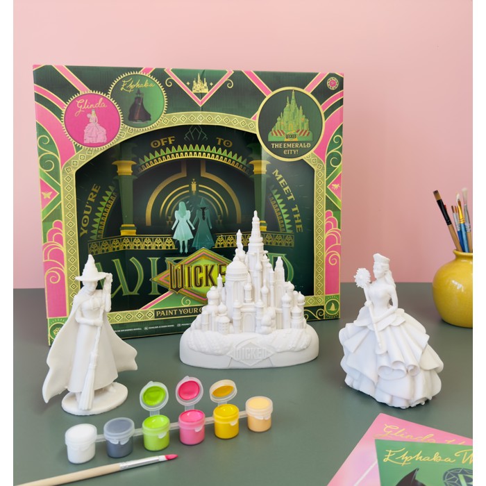 Get creative with Glinda, Elphaba and the Emerald City! Step into the world of Wicked and let your imagination soar with the Wicked Paint Your Own Model Set. Perfect for fans of the beloved musical, this magical craft kit lets children – and grown-ups – paint their own mini versions of Glinda, Elphaba and the iconic Emerald City.