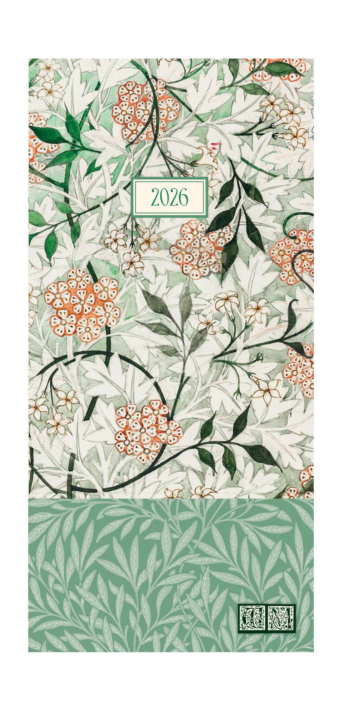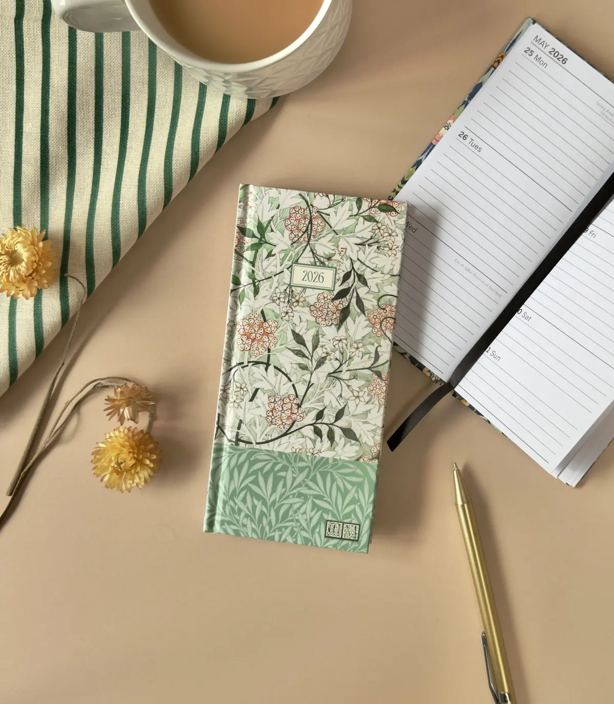 The William Morris 2026 Limited Edition Jasmine Slim Diary is a stylish and practical companion for the year ahead. This pocket diary features a case bound cover, a handy ribbon marker, and a convenient week-to-view format to help keep your plans in order. It also includes an extensive list of religious and festival holiday dates from around the world, offering a thoughtful global perspective.