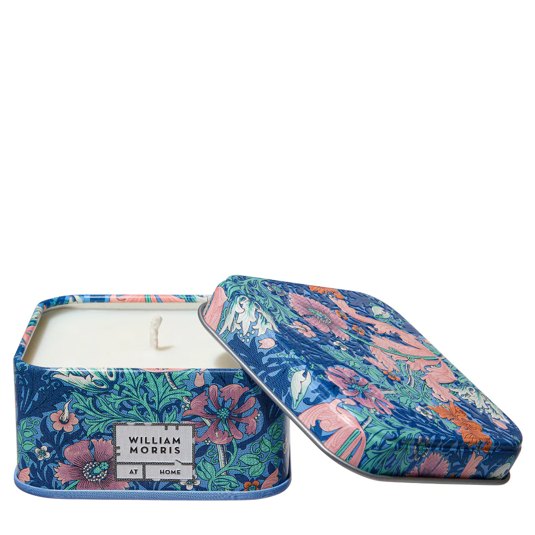 Poured from 100% vegetable wax, the candle offers around 20 hours of relaxing burn time. Housed in a square, lidded tin embossed with William Morris's iconic Compton print, it’s both a practical and decorative gift. Ideal for creating a peaceful evening ritual at home or while travelling.
