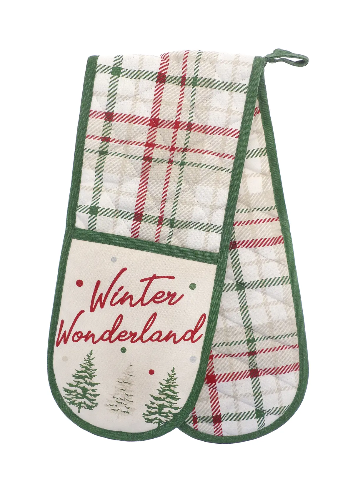 Add a touch of festive charm to your kitchen with the winter wonderland Christmas double oven glove. This beautifully designed oven glove features a delightful holiday pattern with snow-covered trees to get you into the Christmas spirit.