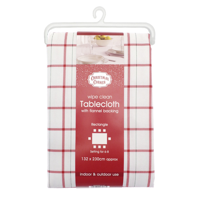 The tablecloth features a classic white background with a red and green chequered pattern, adding a touch of traditional holiday charm to any table setting.