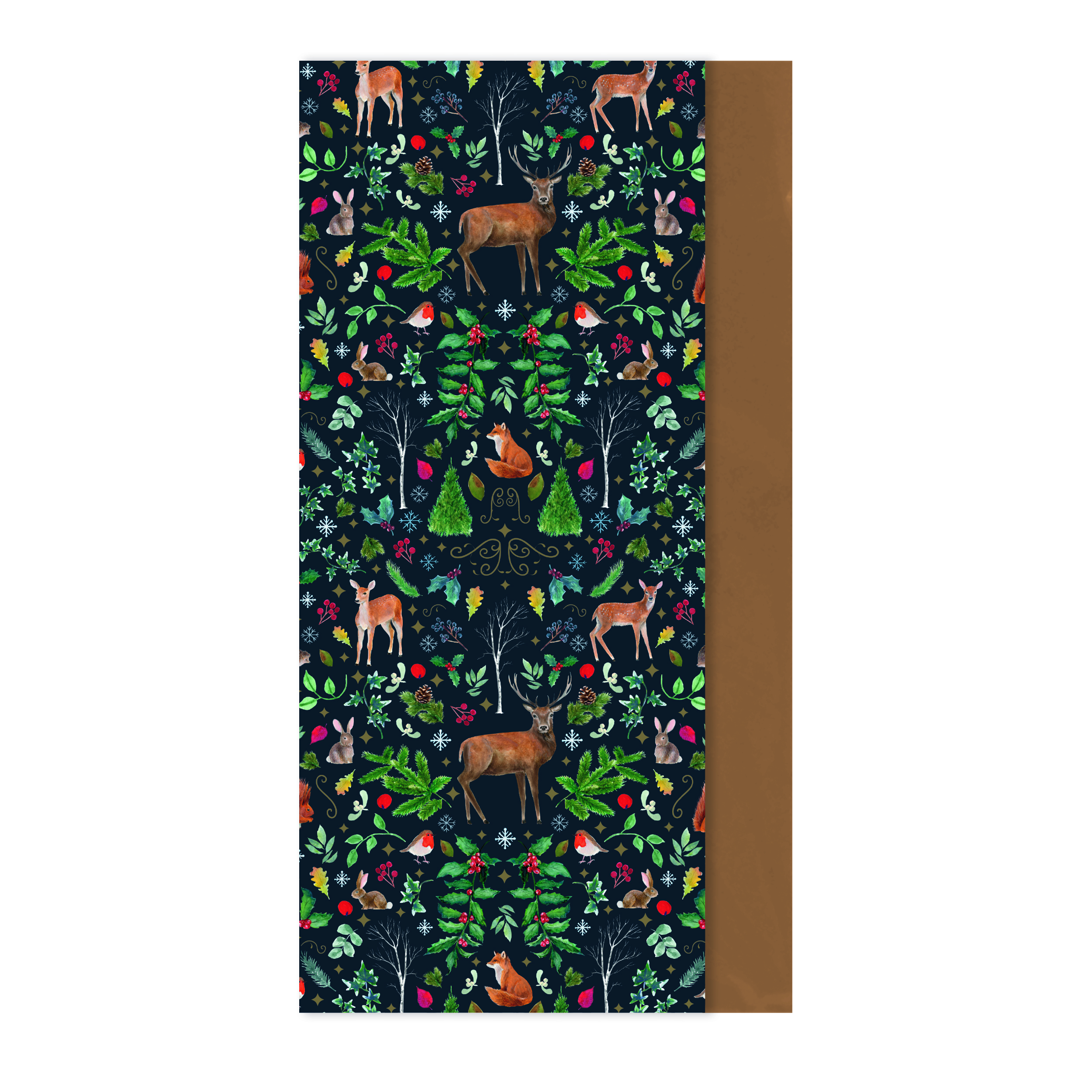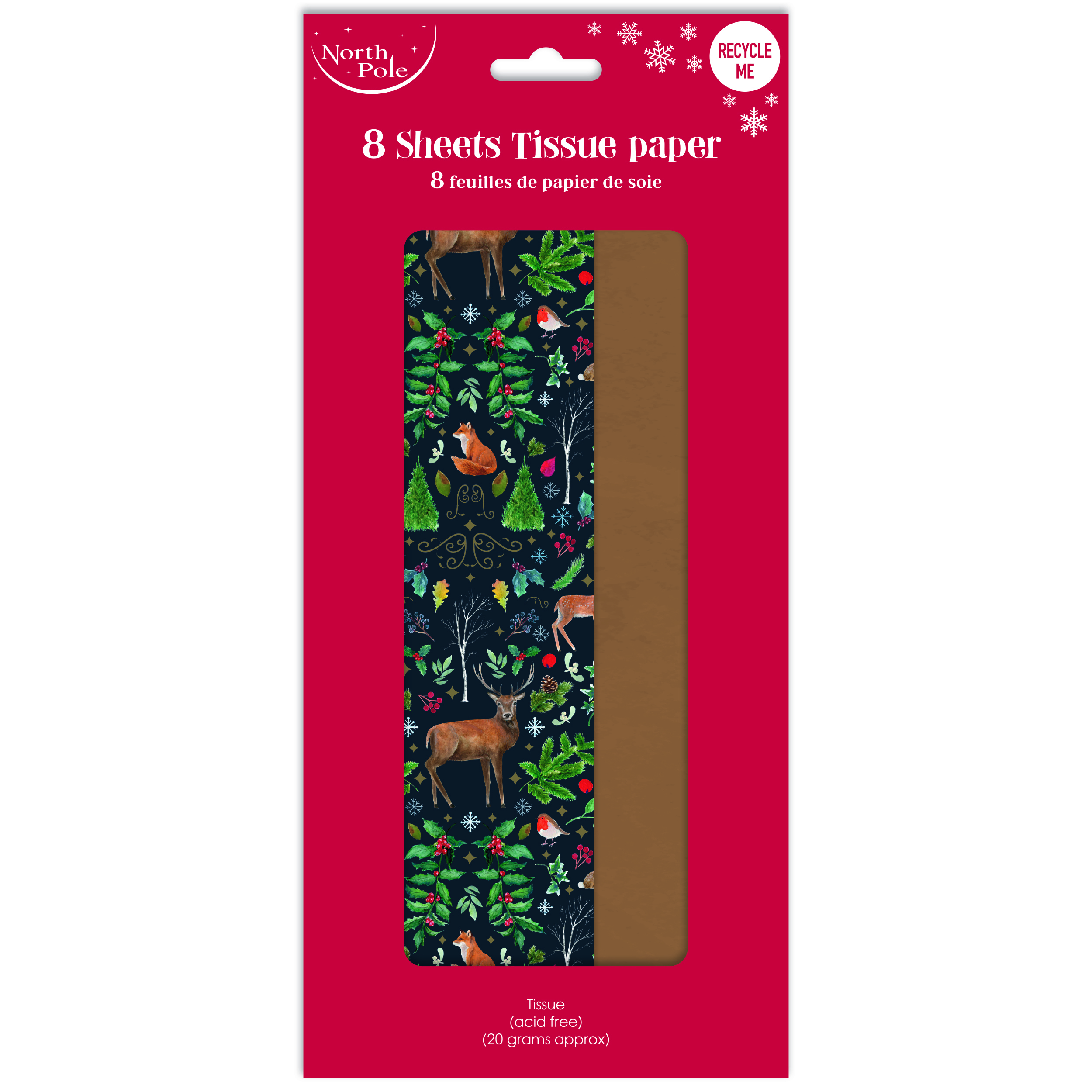 Add a touch of luxury to your Christmas wrapping with this festive tissue paper set, featuring two delightful designs - charming woodland animals and elegant gold accents.