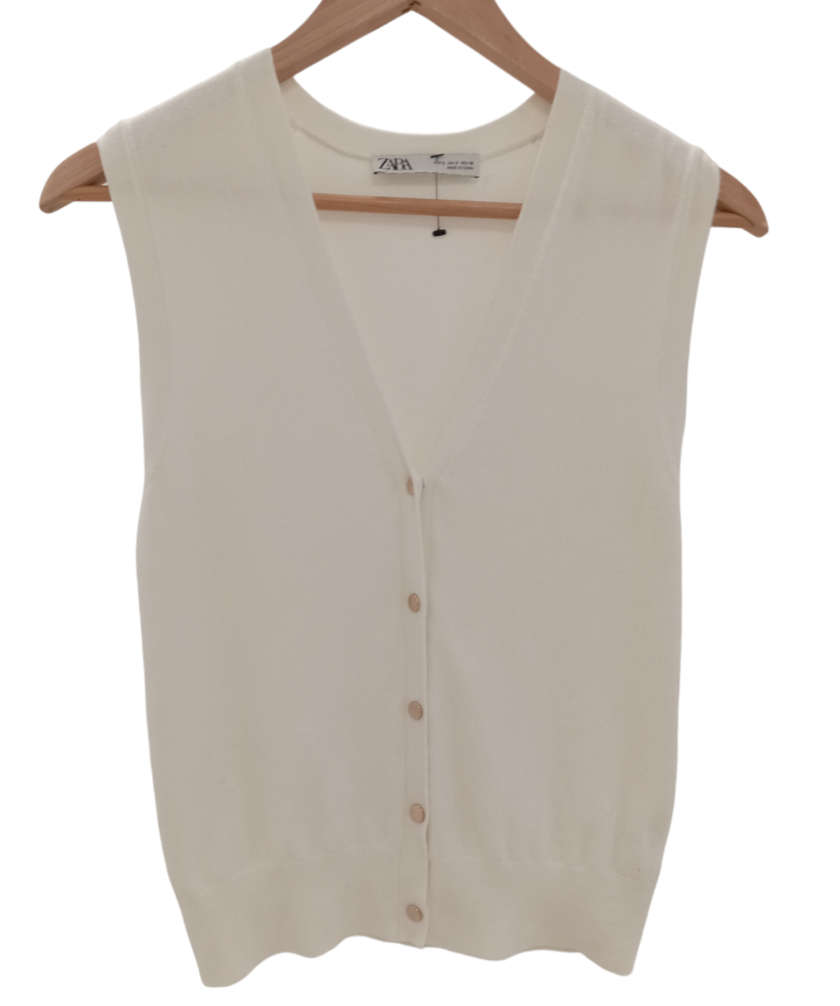 From ZARA, this vest top features a timeless ivory hue and a classic button-up design, exuding simplicity and elegance. The sleeveless silhouette and relaxed fit make it perfect for layering or wearing on its own during warmer days. Whether paired with jeans for a casual look or tucked into a skirt for a more polished outfit, this vest top adds versatility to your wardrobe.