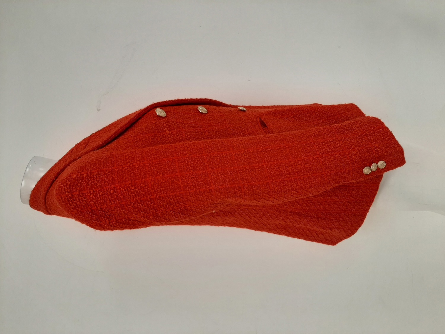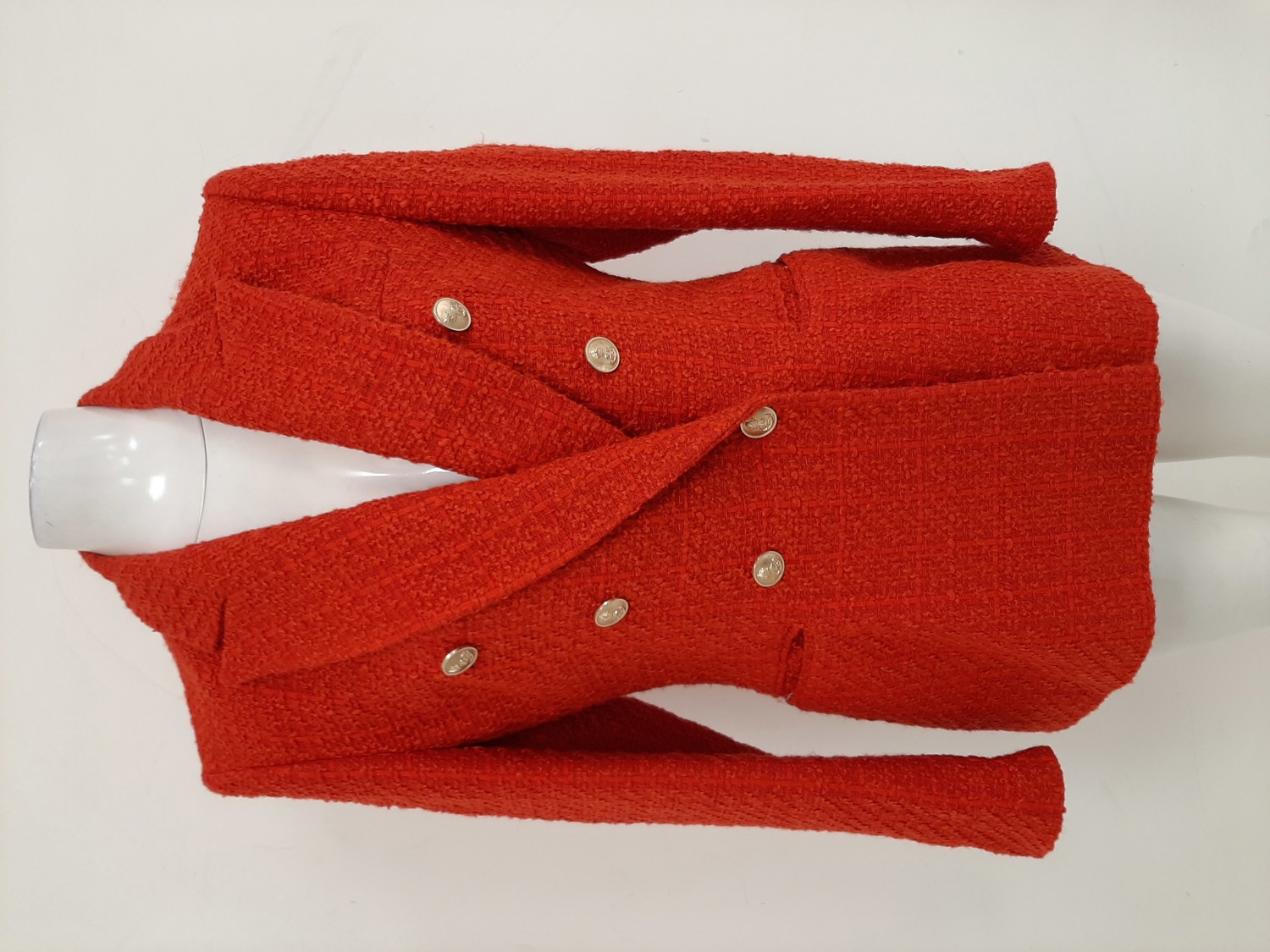 Double-breasted front with statement buttons for a classic tailored look.