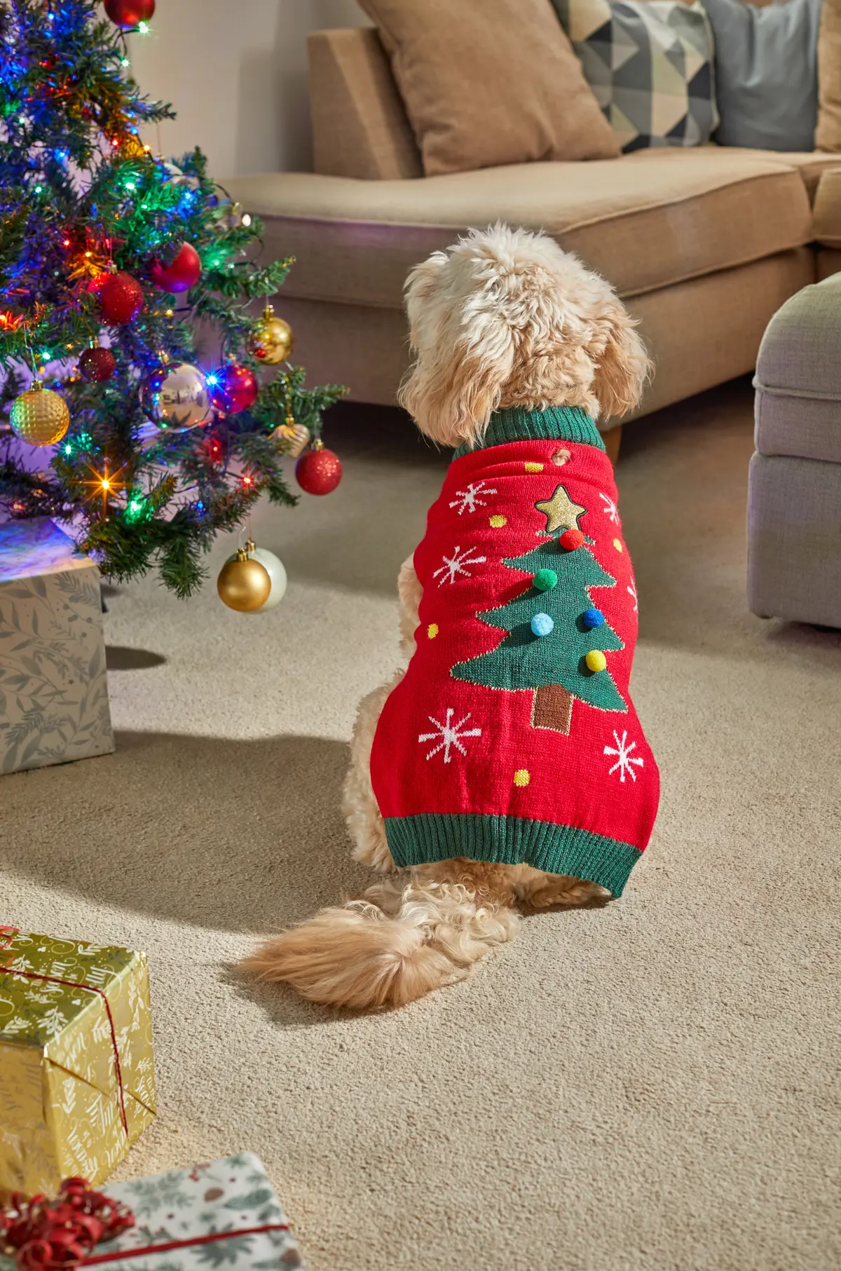 Make your dog the main attraction this Christmas with our adorable TreeMagic jumper! Featuring a traditional Christmas tree design and playful pom-poms, this festive knit brings charm and cheer to your pup’s holiday wardrobe.